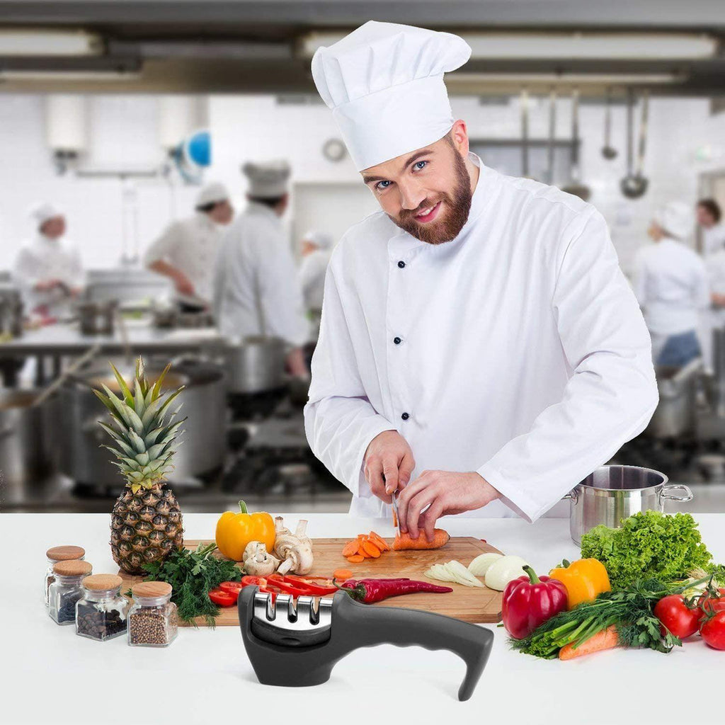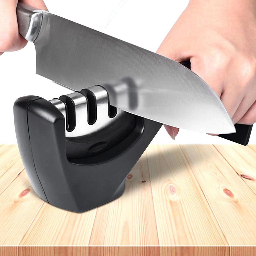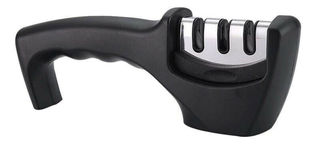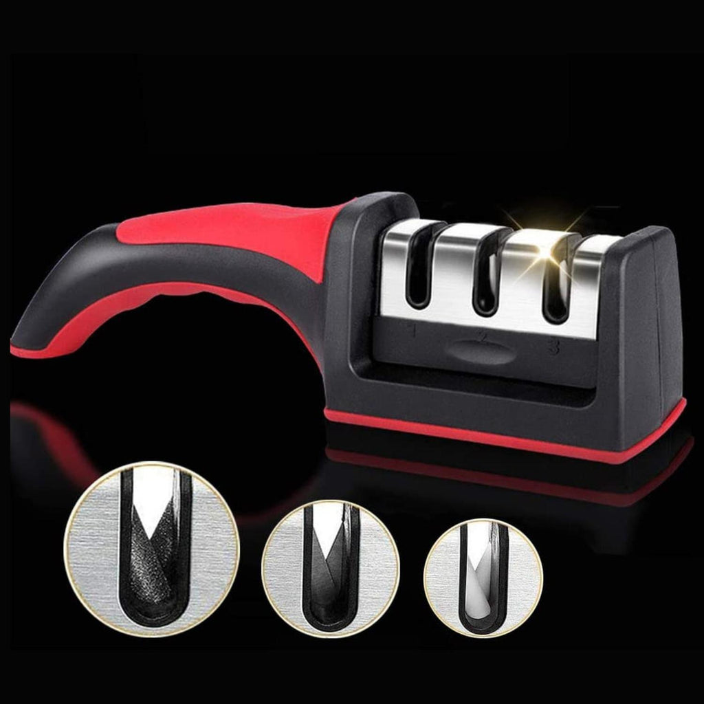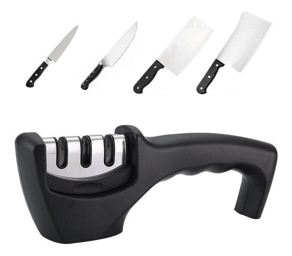 Afilador de cuchillos de 3 etapas diseñado para reparar, afilar y pulir hojas con rapidez y precisión. Su sistema combina ranuras de diamante, tungsteno y cerámica para devolverle a tus cuchillos un filo perfecto en segundos. Ideal para cuchillos de cocina, sashimi, filete de pescado y otros, ofrece resultados profesionales sin complicaciones.