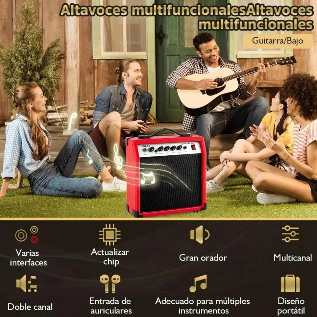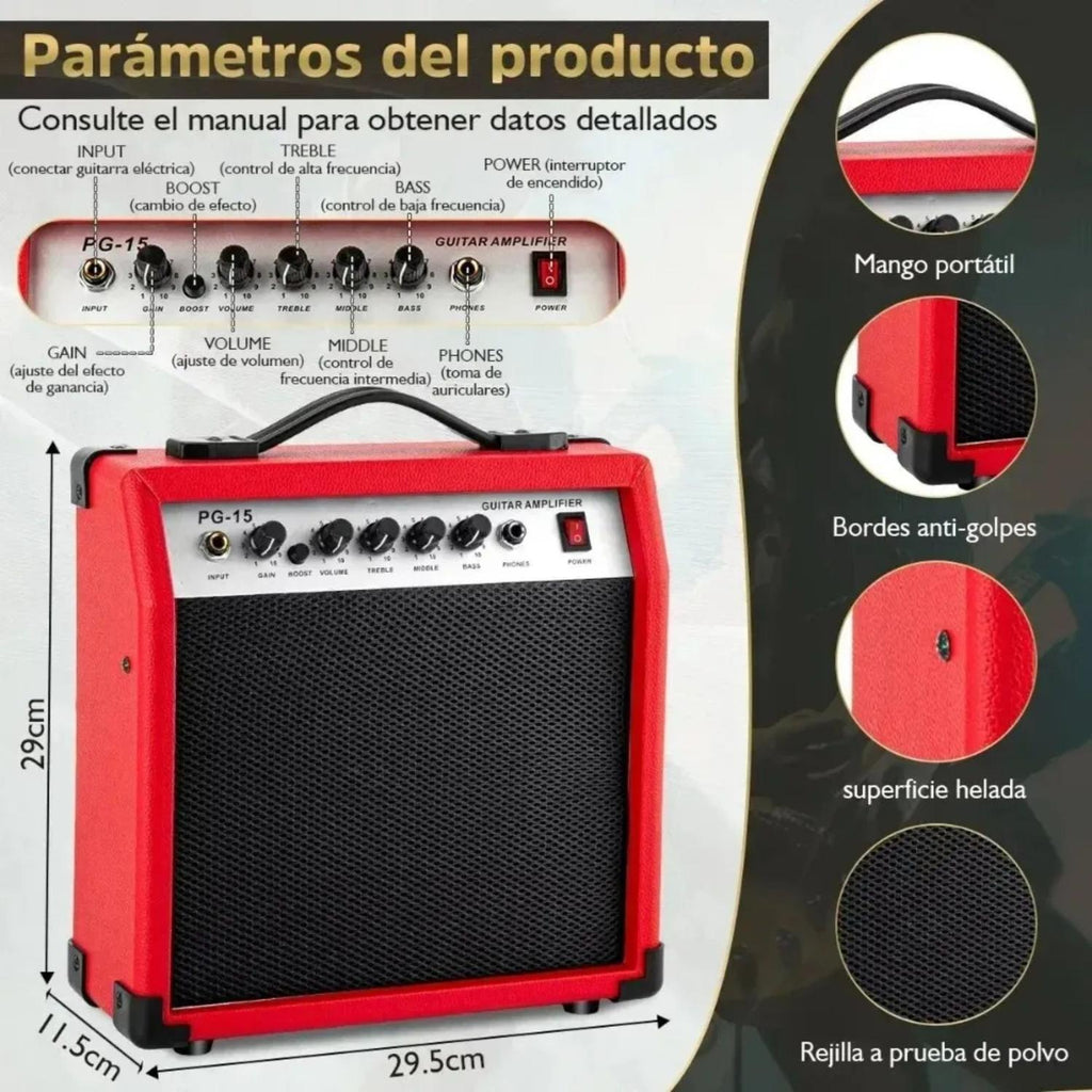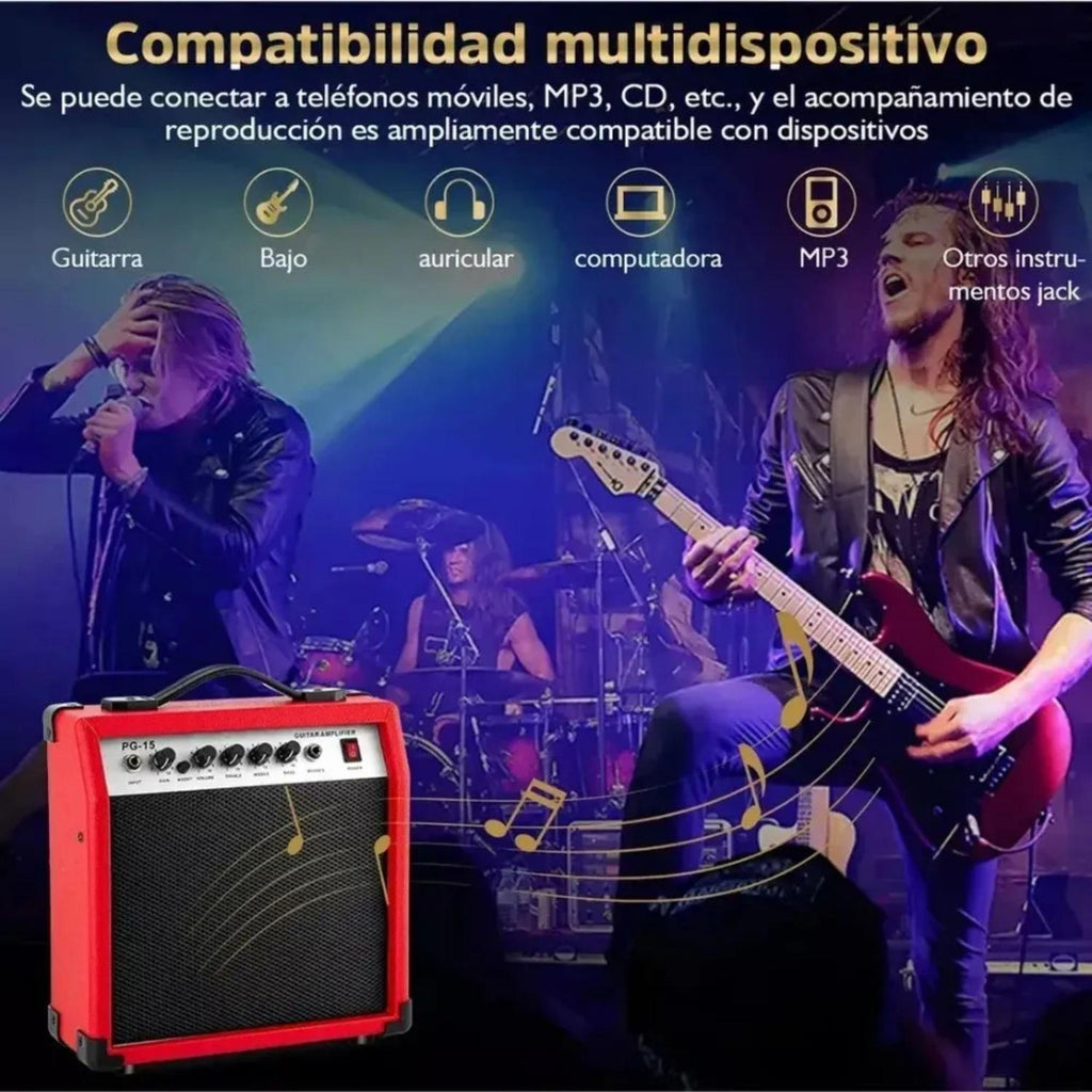 Este amplificador de 15 vatios es ideal para guitarras, bajos y guitarras eléctricas, ofreciendo un sonido claro, potente y versátil para practicar o presentaciones en vivo. Equipado con parlante de 6,5 pulgadas, controles de ganancia, graves, soprano y volumen, permite ajustar el tono y la distorsión según tus necesidades musicales.