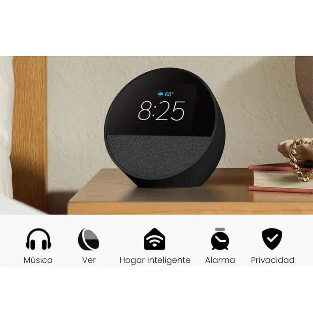 El Amazon Echo Spot es un despertador inteligente moderno con Alexa integrada, diseñado para ofrecerte comodidad, sonido vibrante y funciones personalizables en tu día a día. Su pantalla circular te muestra la hora, el clima, recordatorios y títulos de canciones de un vistazo, mientras que su diseño compacto y estilizado se adapta perfectamente a cualquier habitación. Además, puedes personalizar el fondo de reloj con colores y estilos a tu gusto, convirtiéndolo en un accesorio funcional y decorativo.