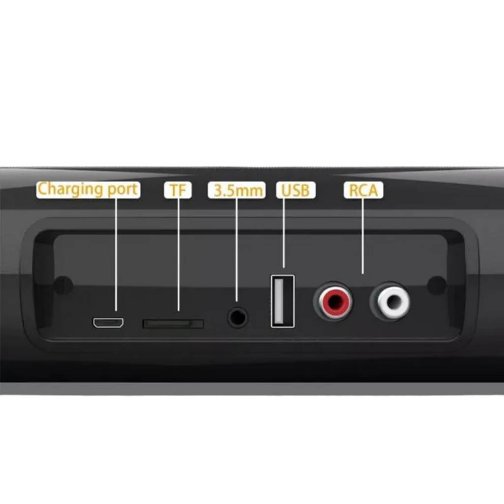 Características principales: • Color: Negro • Potencia: 5 W x4 (total 20 W de salida máxima) • Configuración de canales: 2.0 • Versión Bluetooth: 5.0 • Distancia de conexión Bluetooth: hasta 10 metros • Conectividad: Bluetooth, auxiliar 3.5 mm, RCA, tarjeta TF, USB • Capacidad de la batería: 2000 mAh – 3.7 V • Tiempo de reproducción: hasta 3 horas • Tiempo de carga: aproximadamente 2 horas • Tiempo en espera: hasta 240 horas • Dimensiones: 550 x 50 x 50 mm • Producto 100% recomendado • Garantía legal: 6 meses