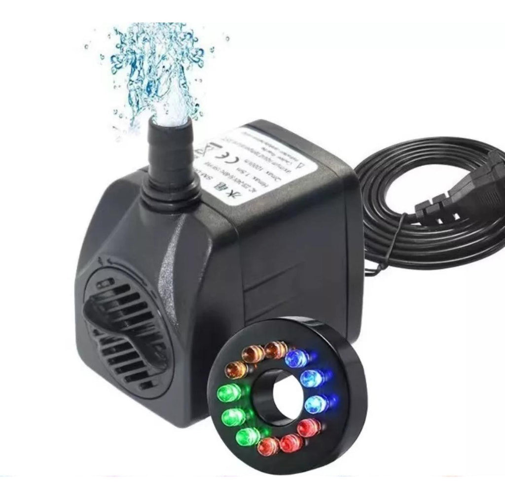 Esta práctica bomba sumergible es ideal para acuarios, fuentes, estanques e incluso sistemas hidropónicos. Funciona con bajo voltaje de 220V y ofrece un rendimiento silencioso y eficiente. Está equipada con 12 luces LED impermeables que entregan una iluminación decorativa espectacular bajo el agua. Su carcasa plástica de alta resistencia y eje de acero inoxidable garantizan una larga vida útil, incluso en agua salada o dulce.
