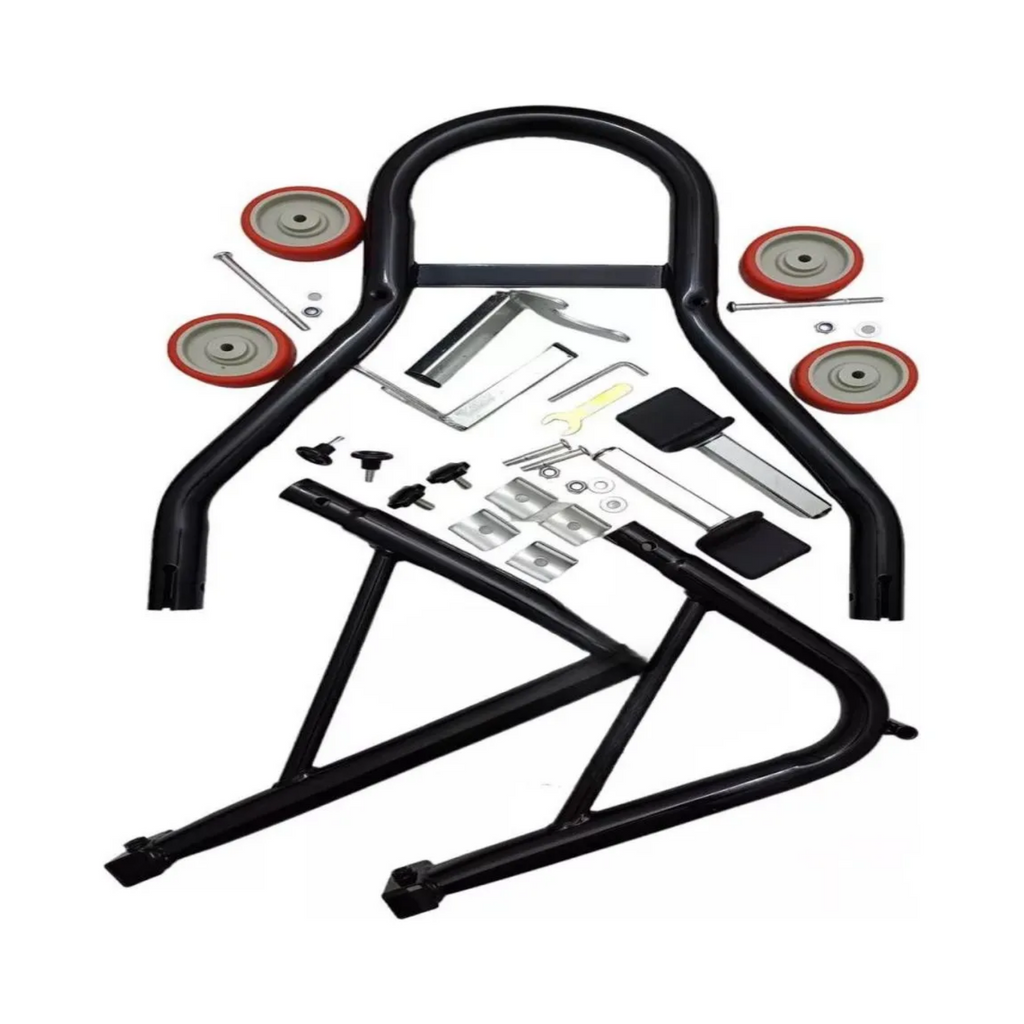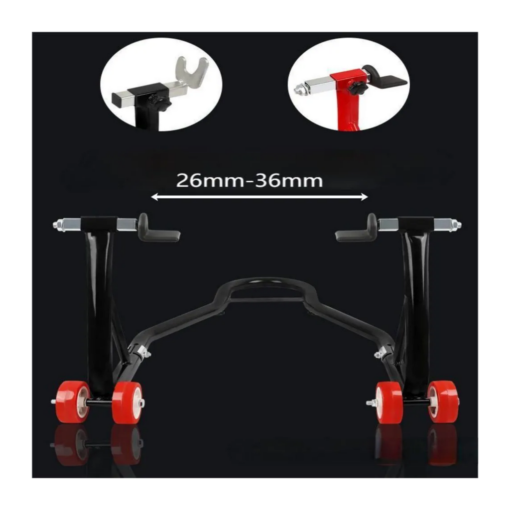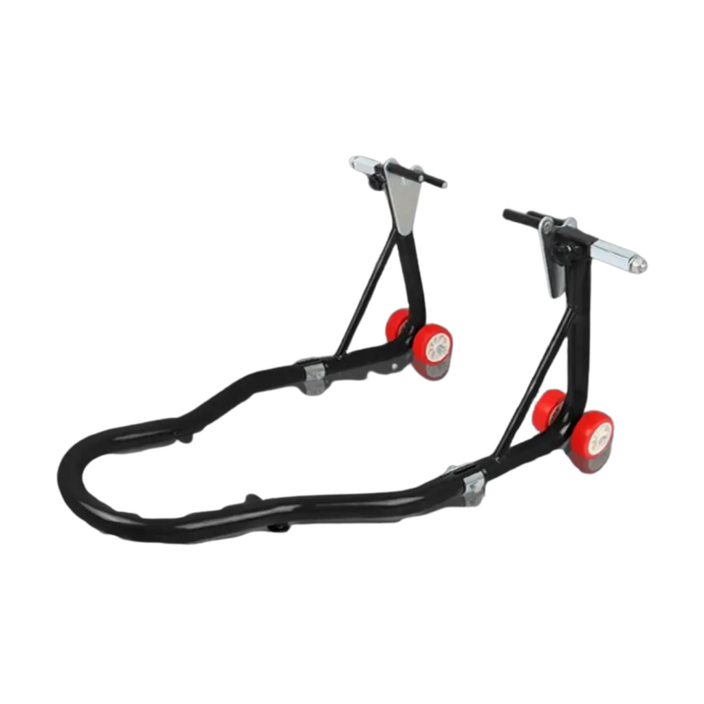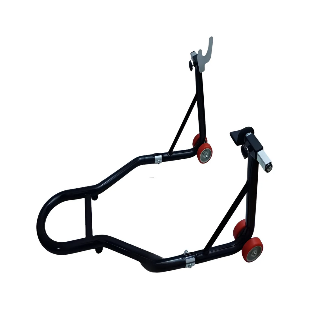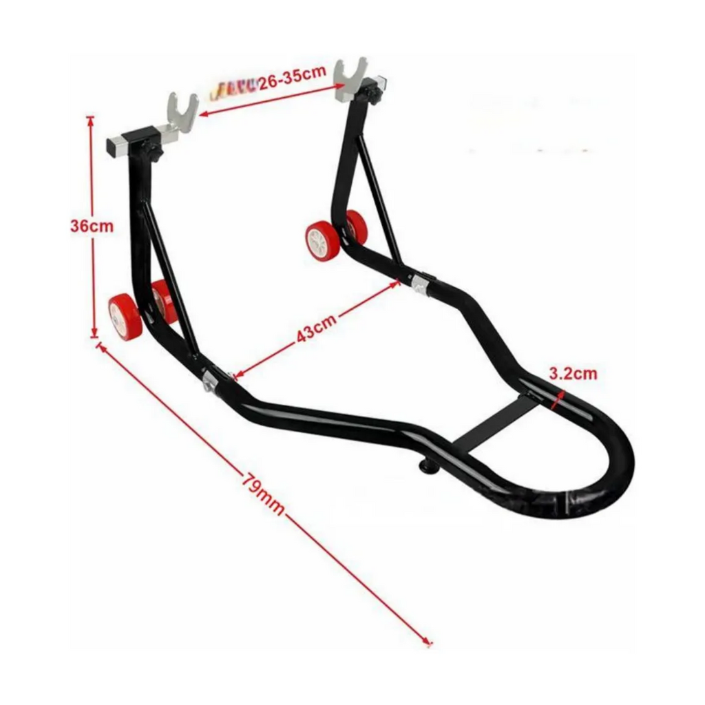 Este caballete elevador trasero es ideal para levantar neumáticos traseros de motos con facilidad y seguridad. Incluye dos tipos de soporte: uno para basculante y otro para spool, lo que lo hace versátil y compatible con diferentes modelos de motocicletas. Su estructura robusta y resistente soporta hasta 220 kilos, facilitando tareas de mantenimiento y reparación. Además, su diseño en color negro le da un acabado profesional y duradero.