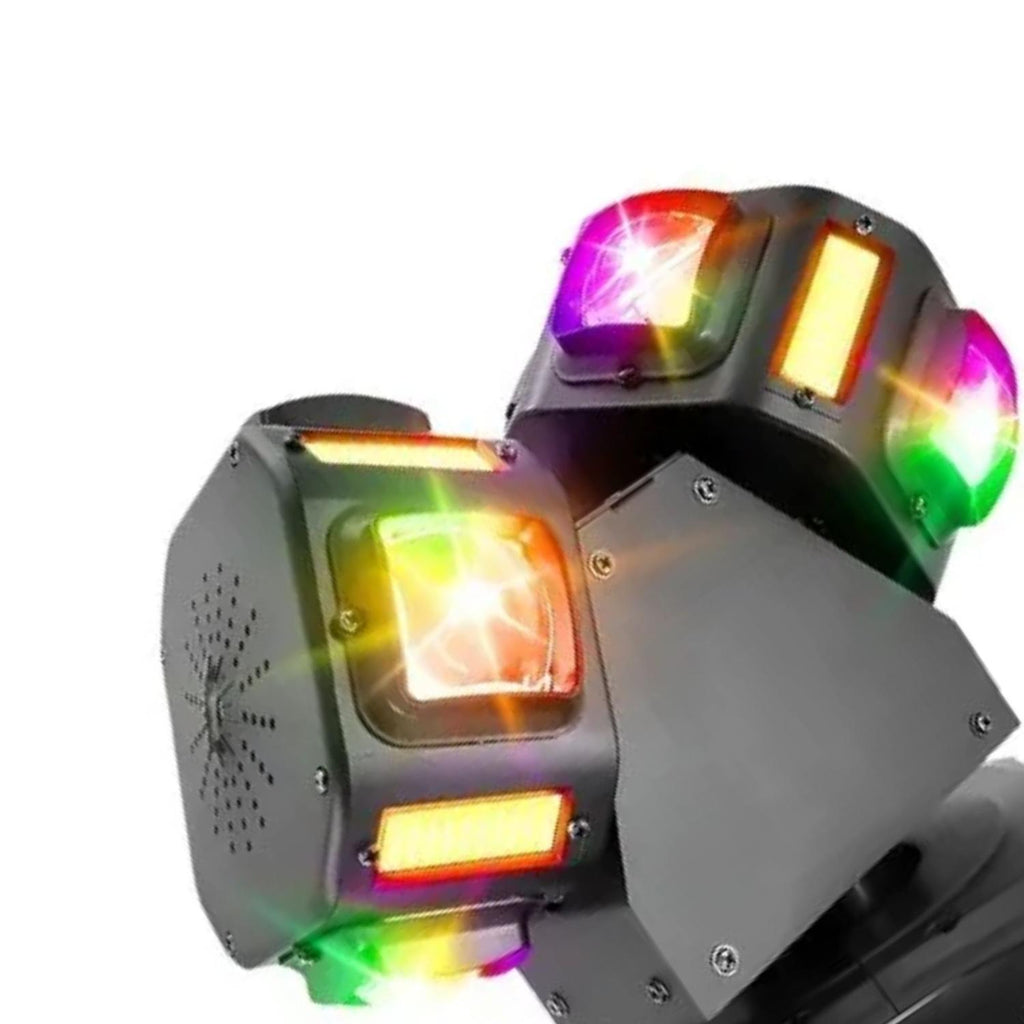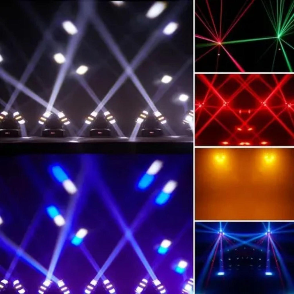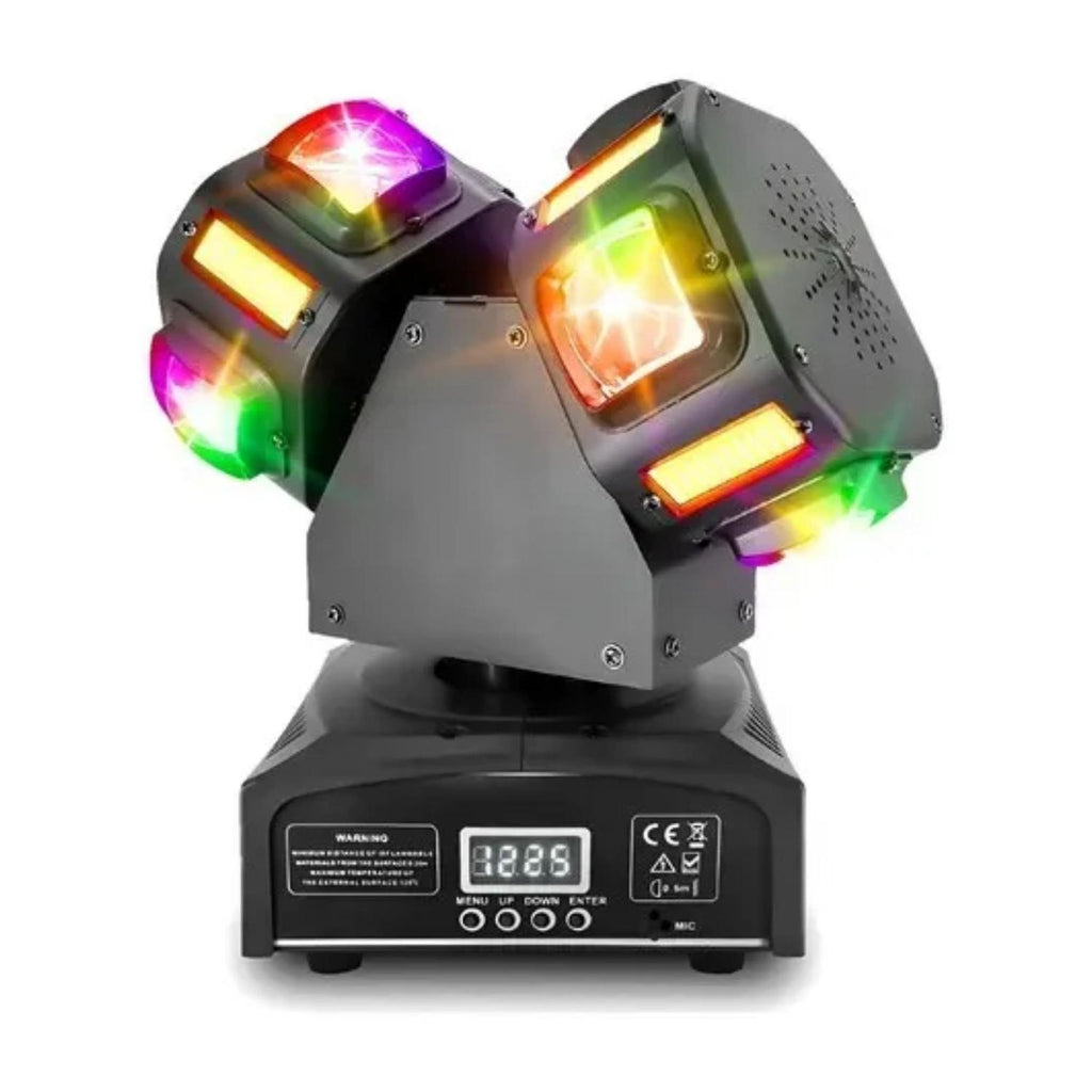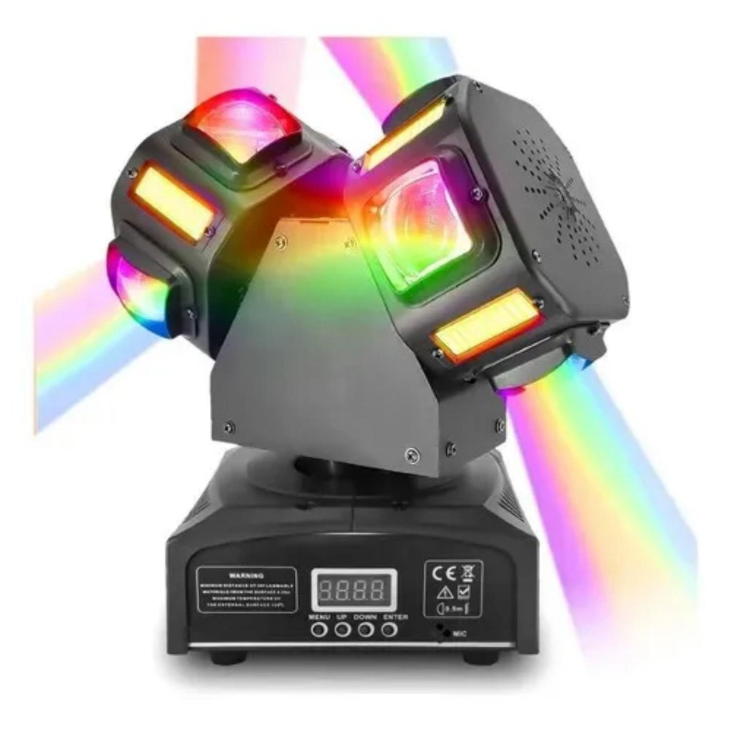 Equipada con perlas LED CREE de alta potencia, láser rojo y verde, y estroboscopio integrado, esta luz combina durabilidad, versatilidad y diseño innovador. Su sistema de control incluye DMX512, maestro-esclavo, automático y por sonido, adaptándose a cualquier necesidad de iluminación. Ideal para escenarios, bodas, karaokes y shows en vivo.