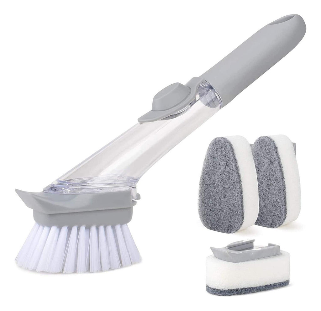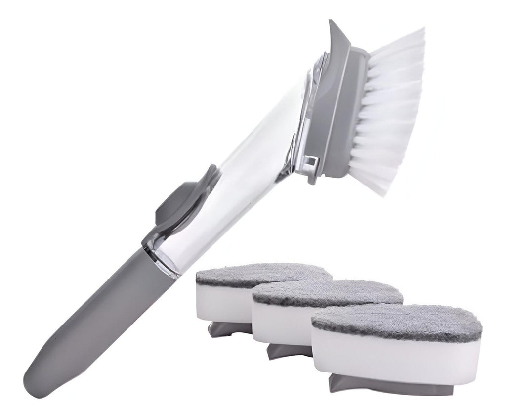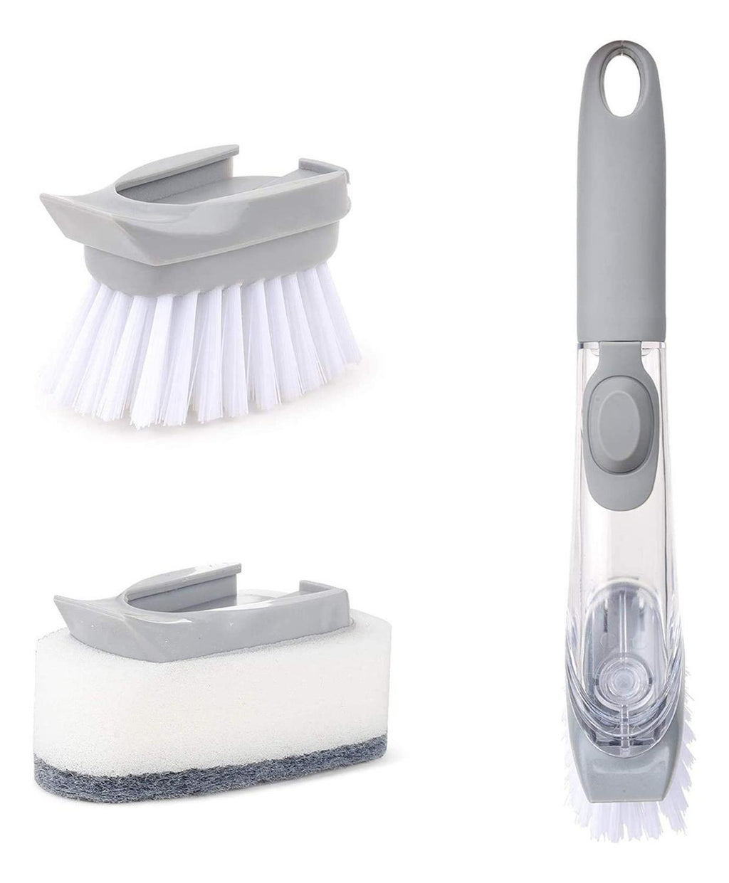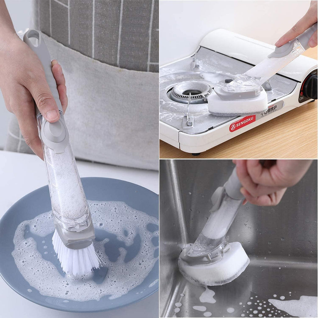 Esponja para fregar Tanque de plástico para líquido limpio, presione el botón para que salga líquido limpio mientras limpia los platos, el piso, la ventana, etc.Cuenta con cerdas fuertes que pueden realizar la limpieza diaria, incluidos utensilios de cocina, ollas, sartenes, platos y cristalería de hierro fundido y antiadherentes. Durable y funcional: material duradero, la botella de almacenamiento está diseñada con material transparente y se puede ver el líquido remanente, limpieza superior. Material: PVC. Medidas: 23,5 cm × 5 cm. Peso: 0,342. Color: Gris. Producto 100% recomendado. Garantía Legal de 6 meses.