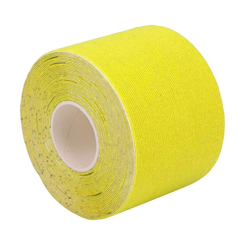 La cinta kinesiológica de apoyo muscular color amarillo mide 5 cm de ancho por 5 metros de largo y está diseñada para ofrecer soporte eficaz al tejido muscular, ayudar a relajar los músculos y mejorar la circulación sanguínea. Su adhesivo está formulado con fibras suaves de algodón y viscosa, que no irritan la piel y son cómodas para un uso prolongado. Además, cuenta con un diseño transpirable e impermeable que absorbe el sudor para mayor comodidad durante la actividad física.