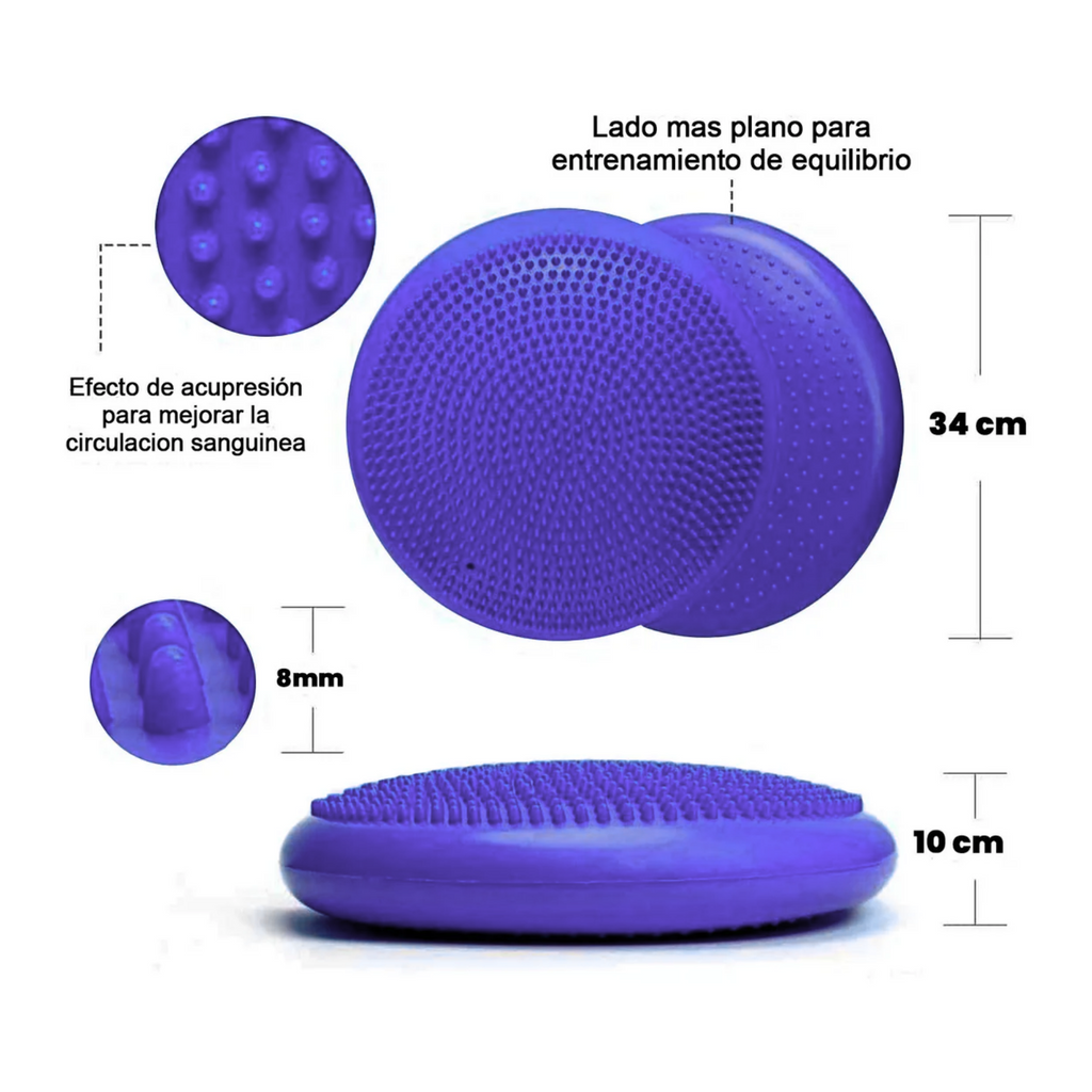 El cojín cuenta con un punto de masaje de doble cara que ofrece diferentes niveles de intensidad: un lado con golpes altos para masajes profundos y otro con pequeños golpes para ejercicios de equilibrio más suaves. Su construcción resistente soporta diversas condiciones y tiene una alta capacidad de carga. Incluye un balón desinflado y un bombín para inflarlo fácilmente.