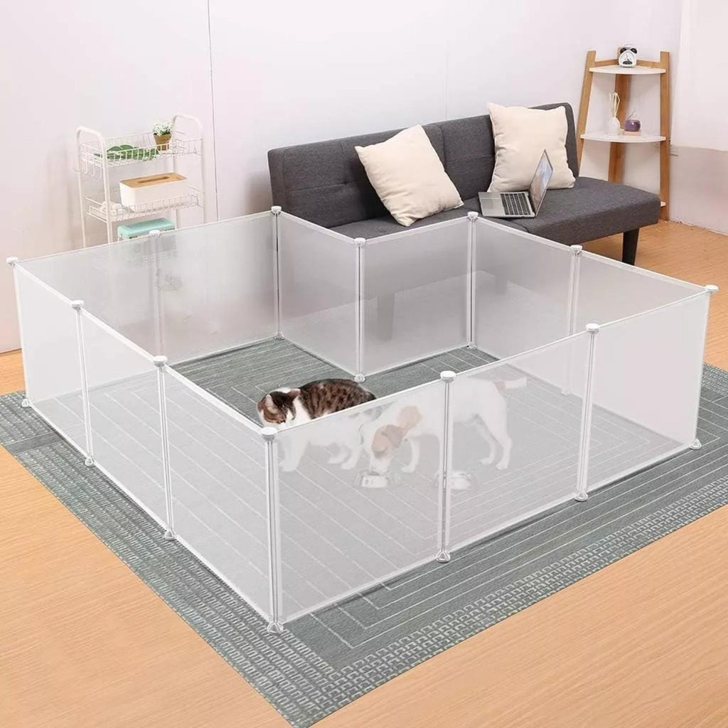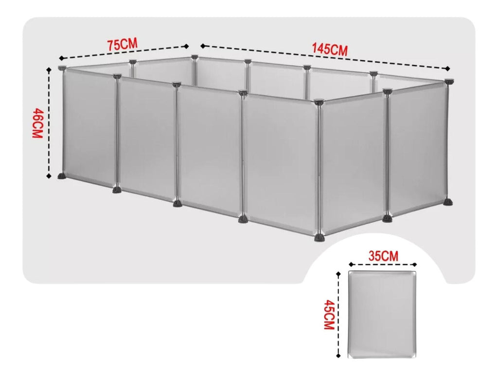 La jaula corral de plástico para mascotas está hecho de varios paneles de plástico translúcido de alta calidad. Resistente y duradero, no causará ningún daño a tu mascota. Puedes mirarlos desde cualquier ángulo, las mascotas lo pasará bien en el interior. El corral para mascotas se puede utilizar tanto en interiores como en exteriores. Puedes utilizar conectores para conectar en diferentes formas para satisfacer el espacio de tu hogar. Dimensiones del Panel A: 35 x 45 cm. Dimensiones del Panel C: 35 x 35 cm Color: Blanco Transparente / Negro Material: Metal / Plástico. Peso del producto: 3.4 . Producto 100% Recomendado. Garantia de 6 Meses.