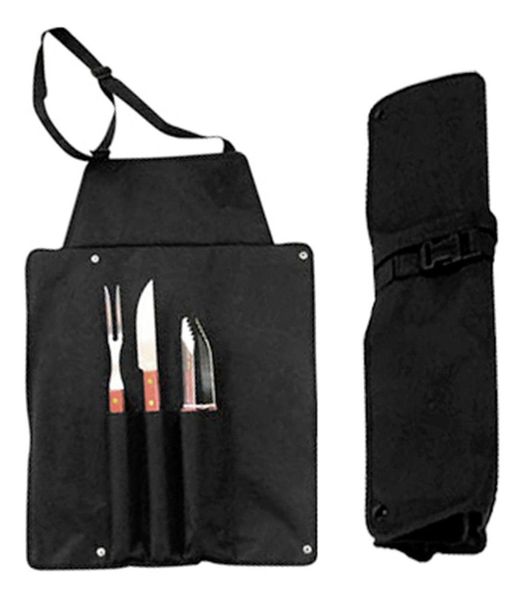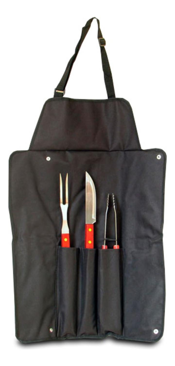 ¡Llévate el complemento ideal para cualquier amante del asado! Este práctico set de delantal y bolso parrillero incluye cuchillo, pincho y tenazas, todo lo necesario para preparar una buena parrillada ya sea en casa, departamento, camping o al aire libre. Su diseño funcional permite guardar todas las herramientas en un práctico delantal que también funciona como bolso de transporte.