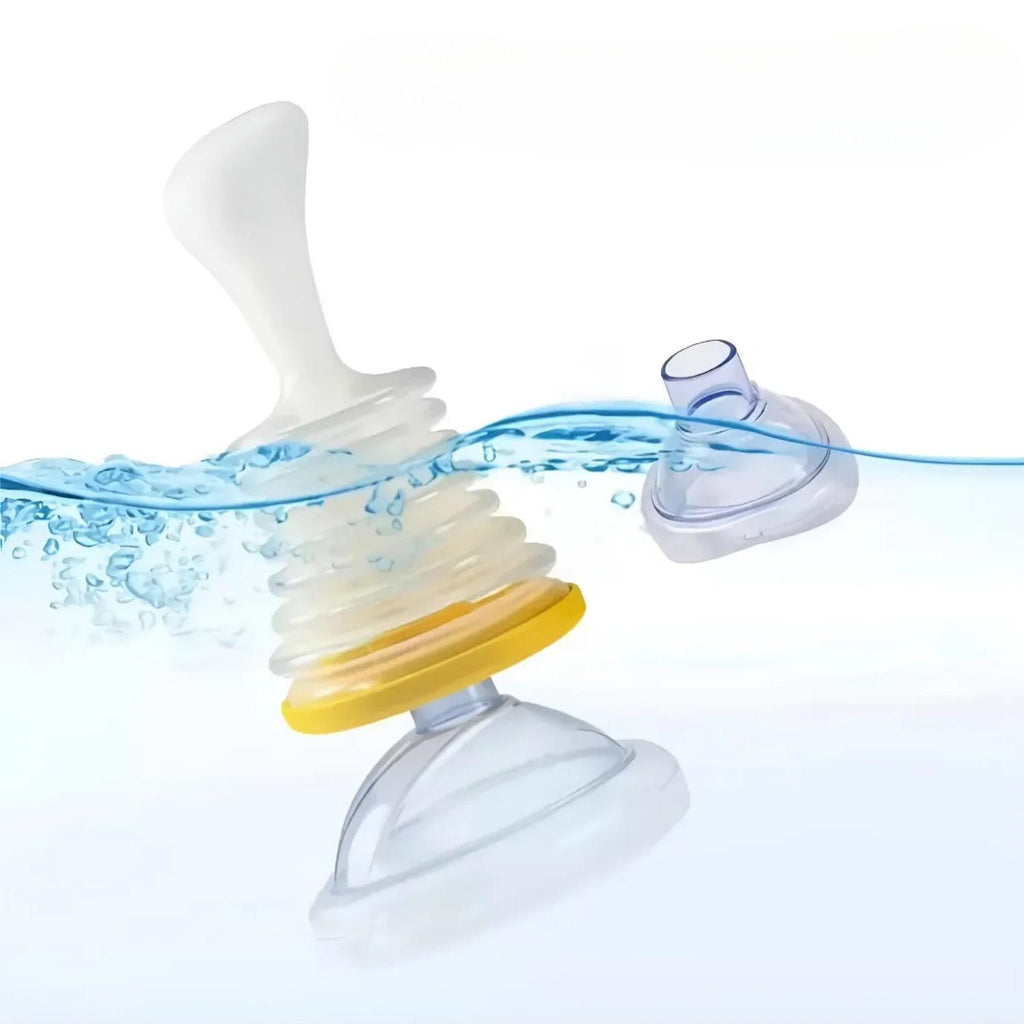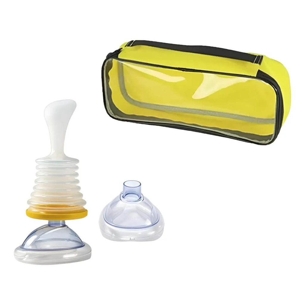 Incluye bolso de transporte, válvula de succión y mascarillas para adultos y niños, ofreciendo una solución completa y práctica en casos de asfixia.