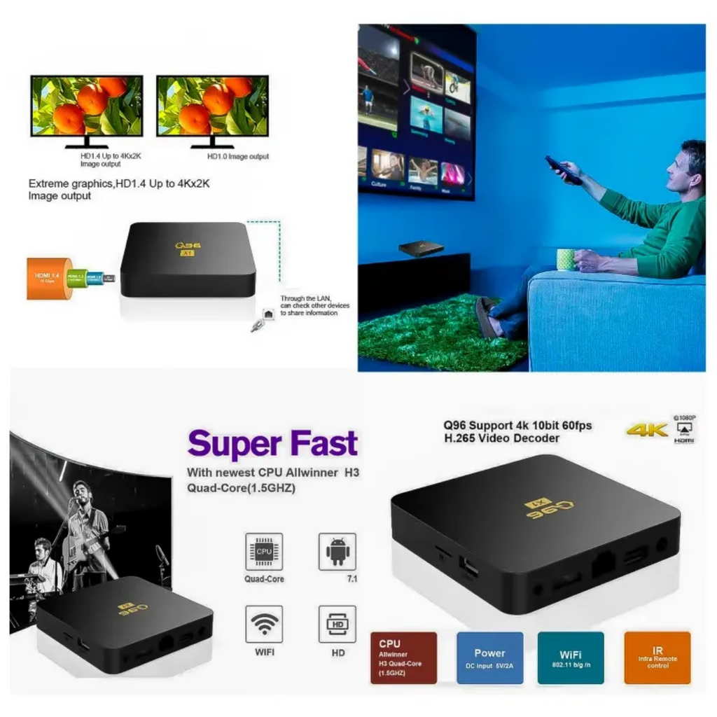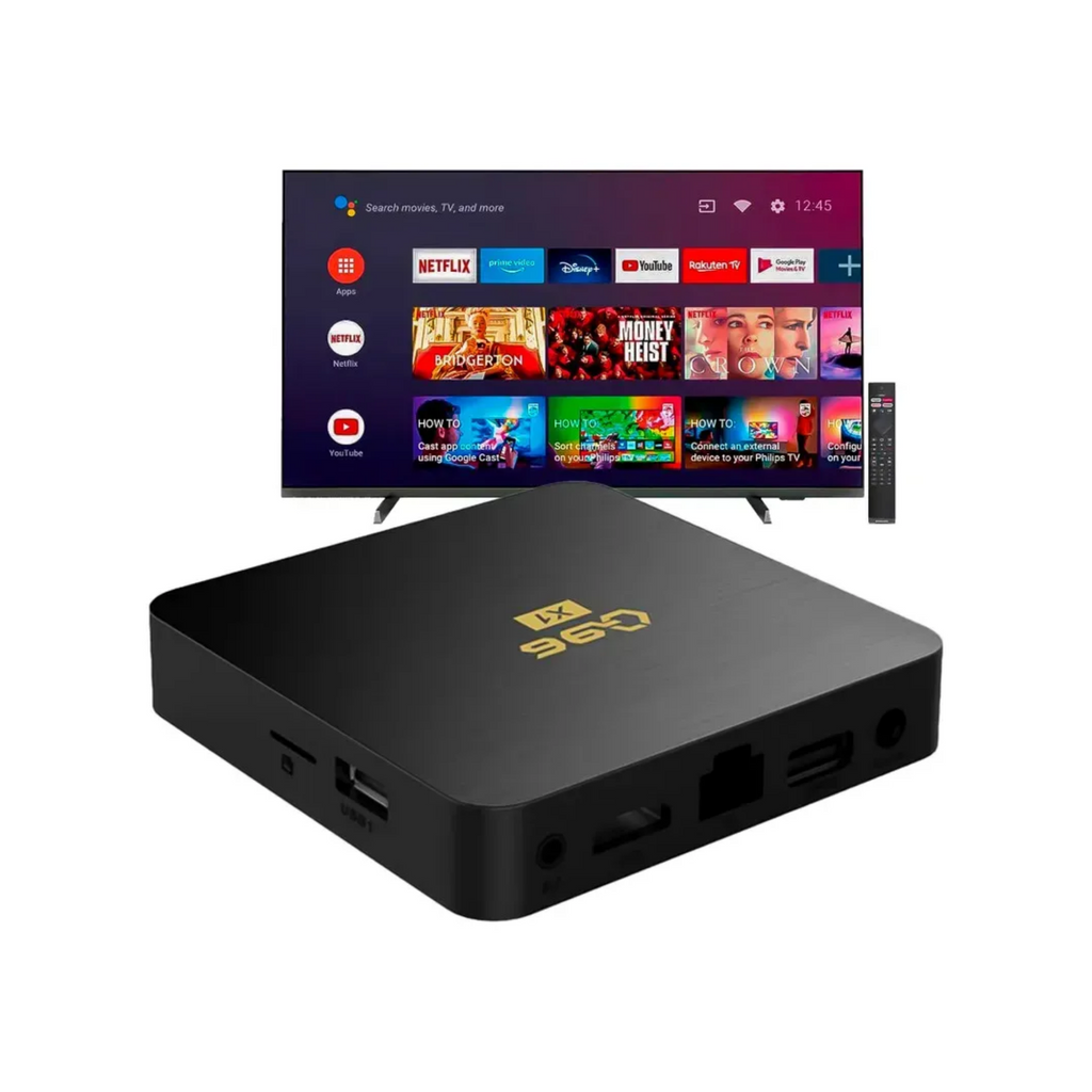 Dispositivo Streaming TV 4K Q96 Mini combina potencia y versatilidad para que disfrutes de contenido en alta definición 4K con gran fluidez gracias a sus 8 GB de RAM y 128 GB de almacenamiento. Su sistema operativo Android facilita la descarga y uso de tus aplicaciones favoritas, mientras que sus múltiples puertos (AV, Ethernet, HDMI, SD) aseguran la conexión con diversos dispositivos.