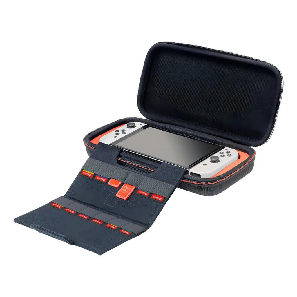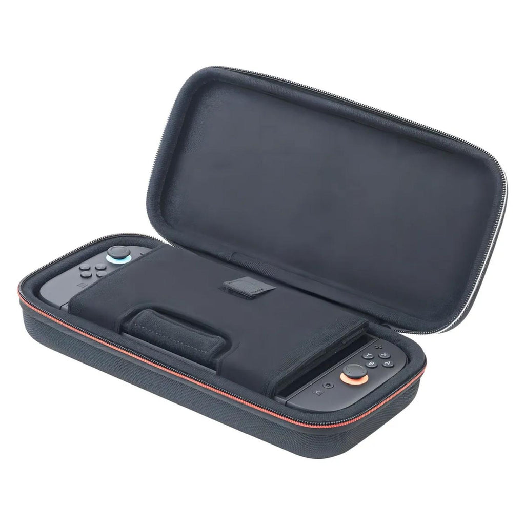 El estuche cuenta con divisores acolchados para proteger los joysticks, un soporte integrado para colocar la consola en distintas posiciones de visualización y un bolsillo con cremallera para accesorios pequeños. También ofrece espacio para almacenar hasta 12 cartuchos de juego y 2 tarjetas microSD, y dispone de un asa de transporte cómoda para llevarlo a cualquier lugar.