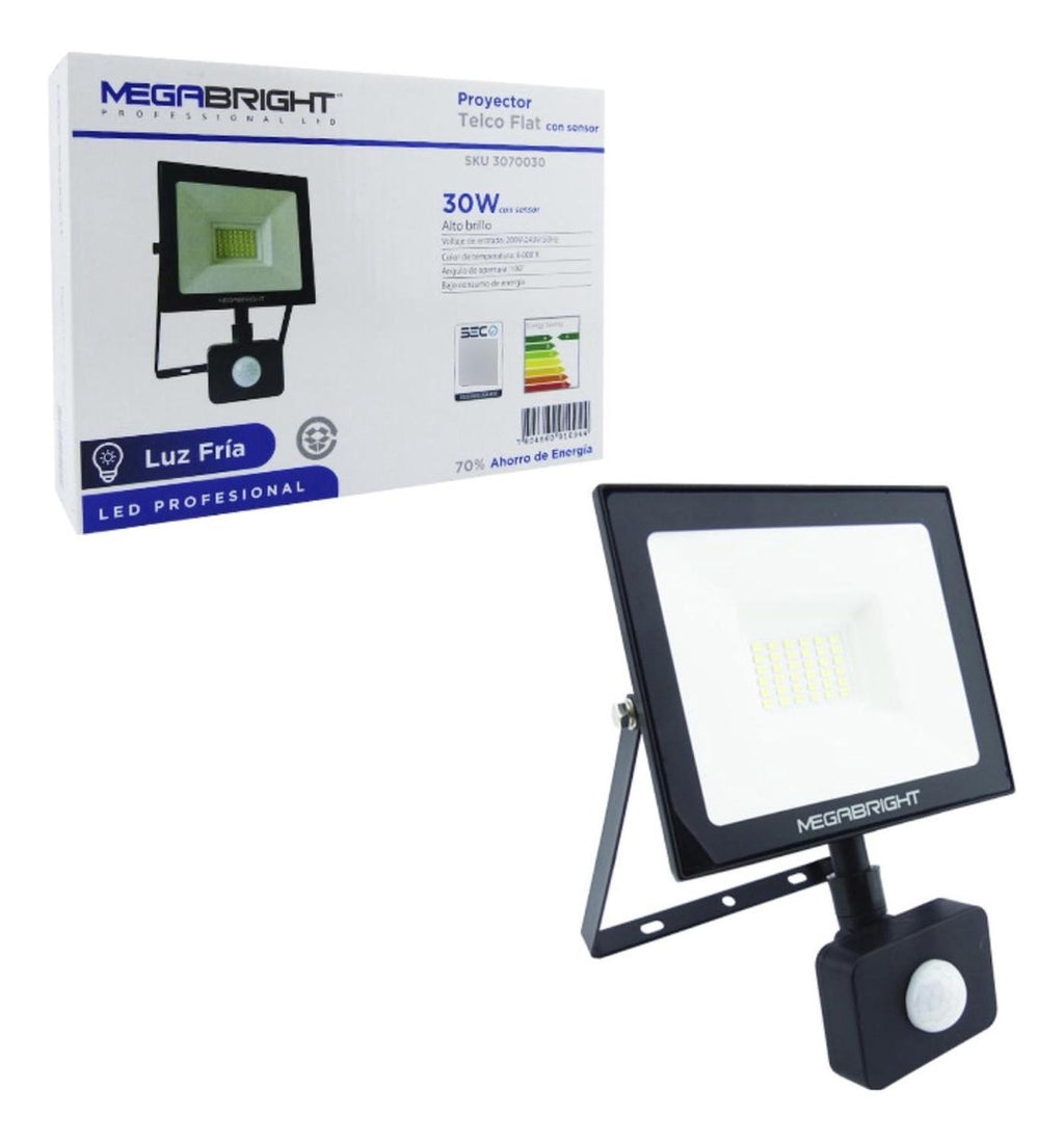 Foco LED halogeno con sensor de movimiento, para iluminación de exteriores, fachadas, jardines, multicanchas etc.Luz fria de 6000K, con vida util de 40.000 horas. Se adapta con exito al entorno. Producto de alta calidad. Foco certificado. Medidas: 23 x 17 x 2,7 cm. Tipo de luz: Fría. Voltaje: 220V - 240V/50HZ. Potencia: 30WATT, 2.400 LUMENES. Vida util: 40.000 HRS. Peso: 0.51 kg. Color: Negro. Material: Metal y plástico. Producto 100% recomendado. Garantía Legal de 6 meses.
