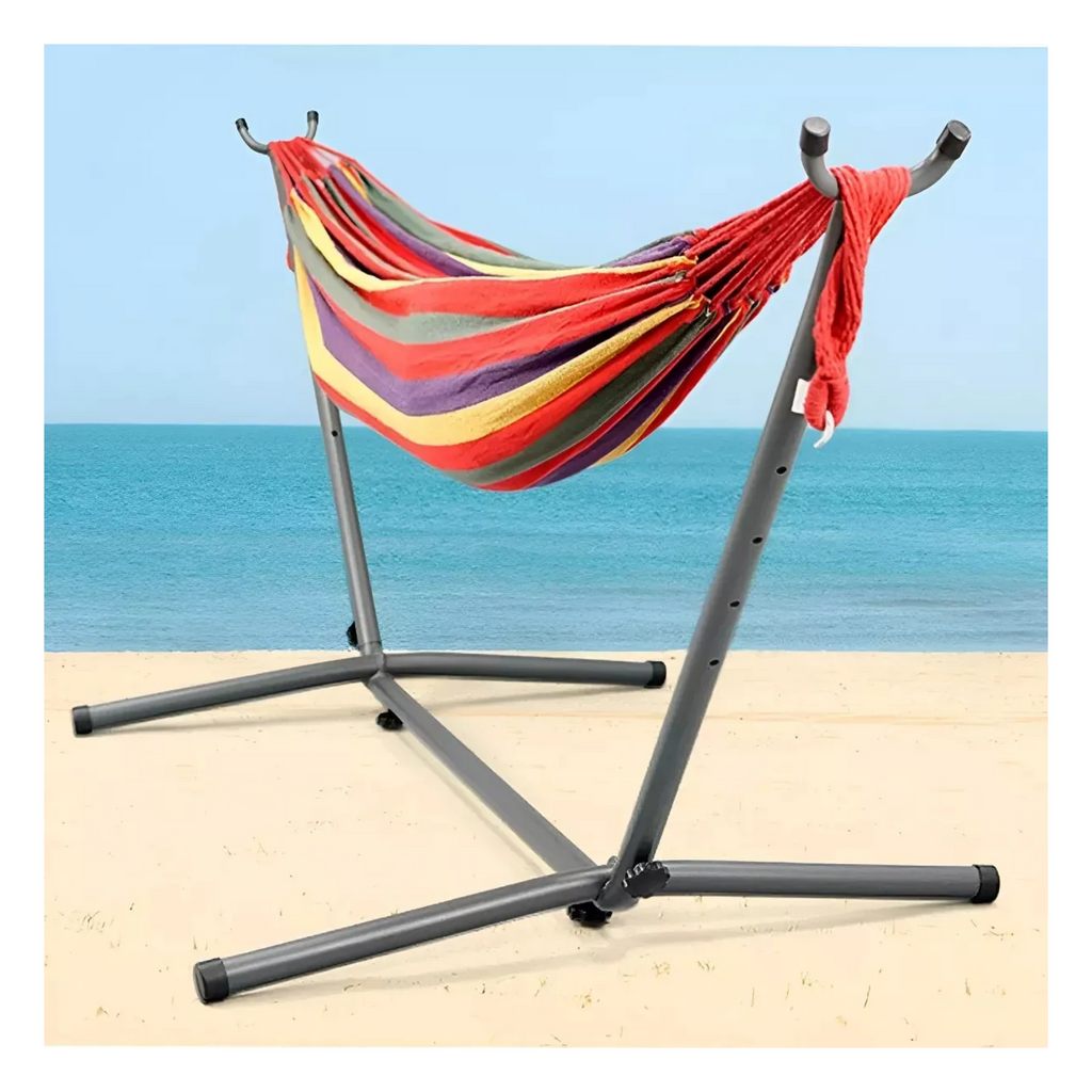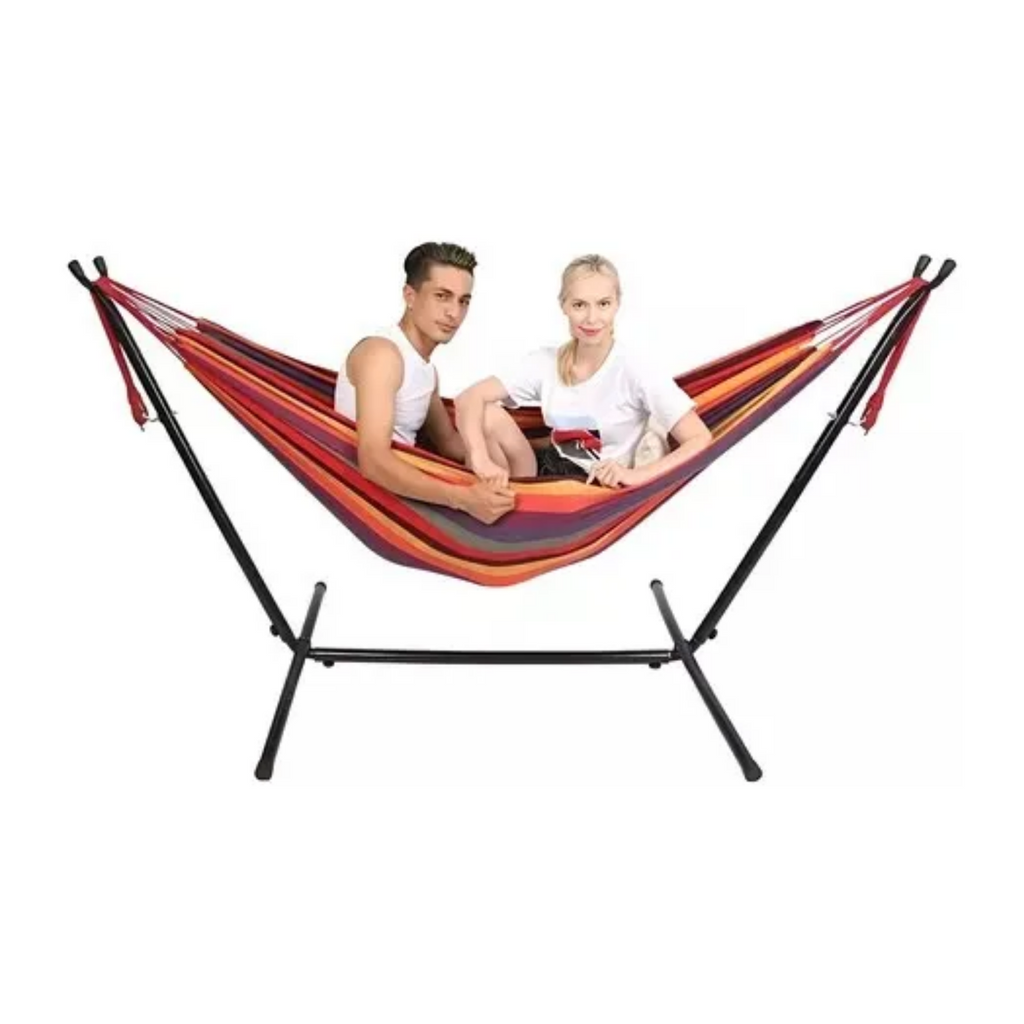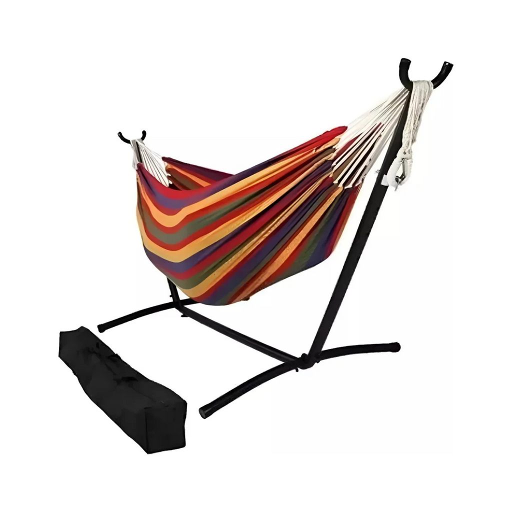 Relájate en cualquier lugar con esta cómoda hamaca doble multicolor con base de acero, ideal para interiores o exteriores. Su estructura resistente y portátil se monta fácilmente sin necesidad de herramientas, brindando una solución práctica y acogedora para descansar donde quieras. Es perfecta para usar en el jardín, la playa, acampadas o incluso dentro de casa, proporcionando un espacio para relajarse solo o acompañado.
