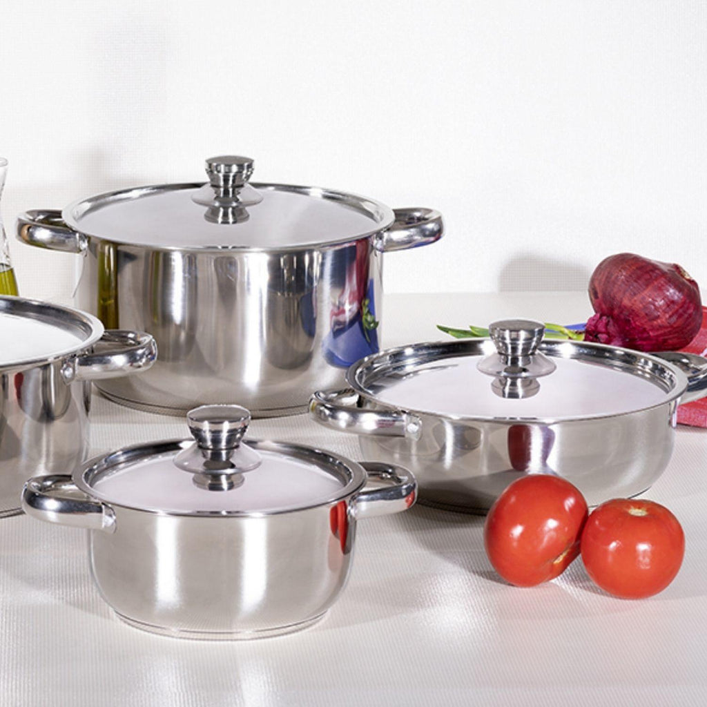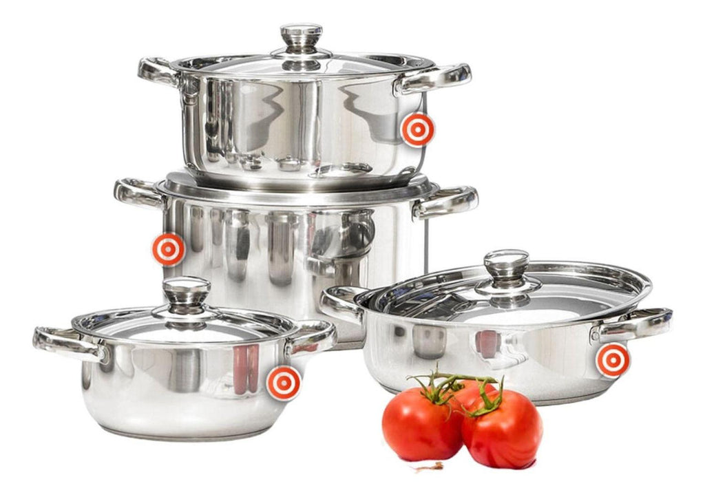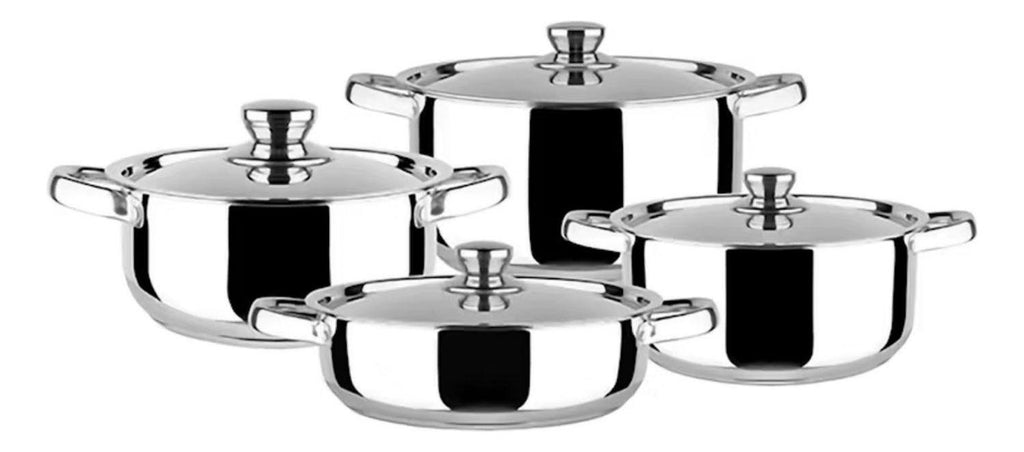 Fabricado en acero inoxidable con acabado pulido espejo por dentro y por fuera, este set ofrece durabilidad, excelente conducción del calor y una apariencia moderna que realzará cualquier cocina. Sus tapas de acero, asas y mangos remachados brindan seguridad y resistencia durante el uso diario.
