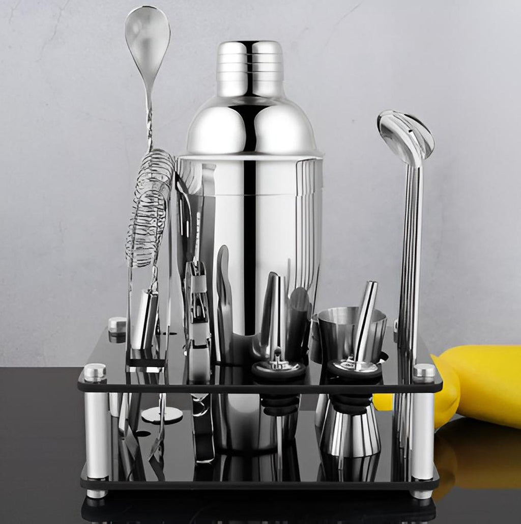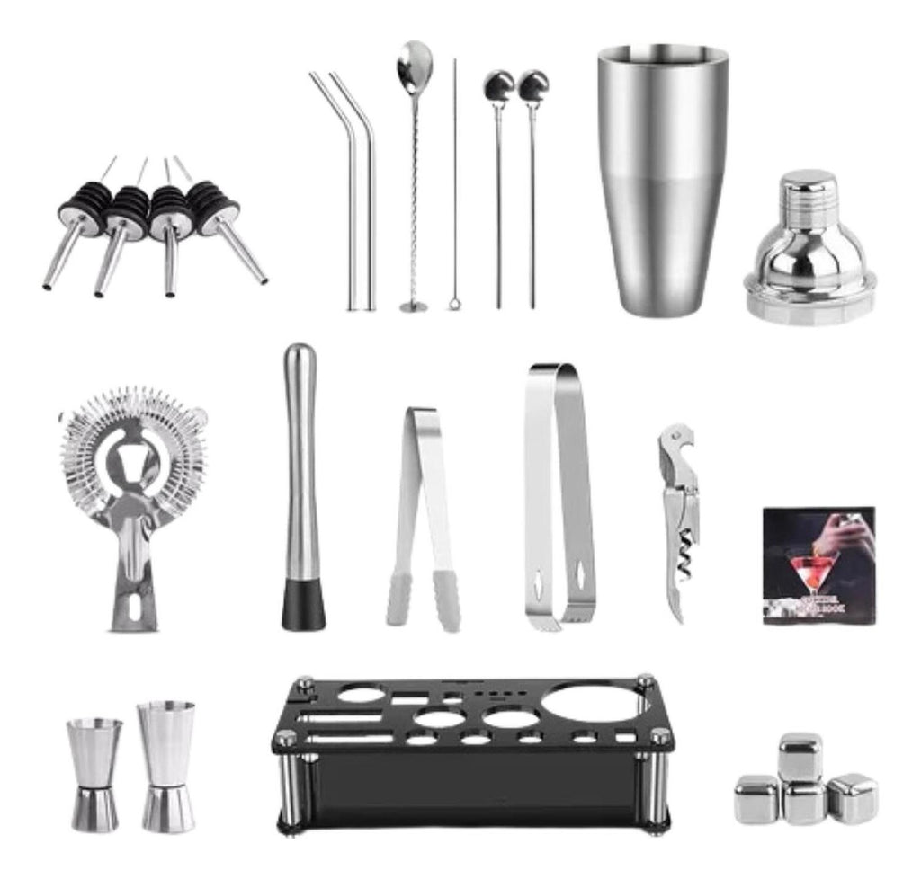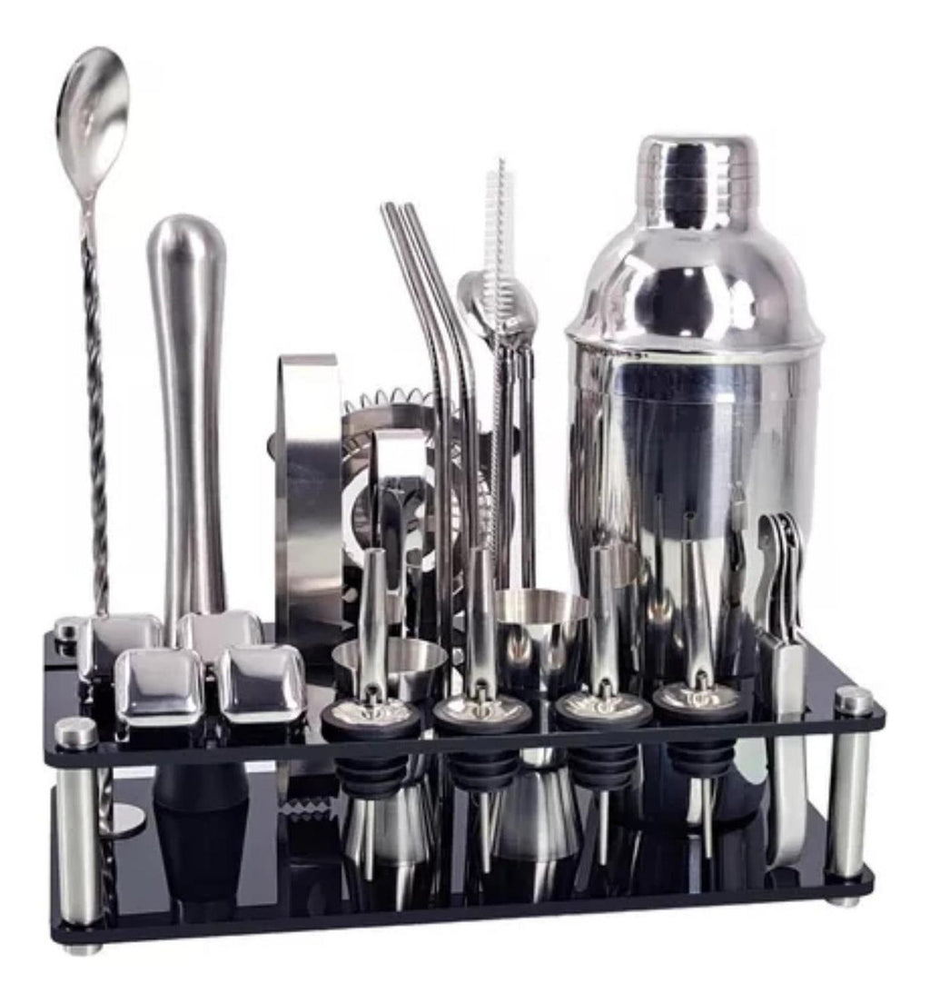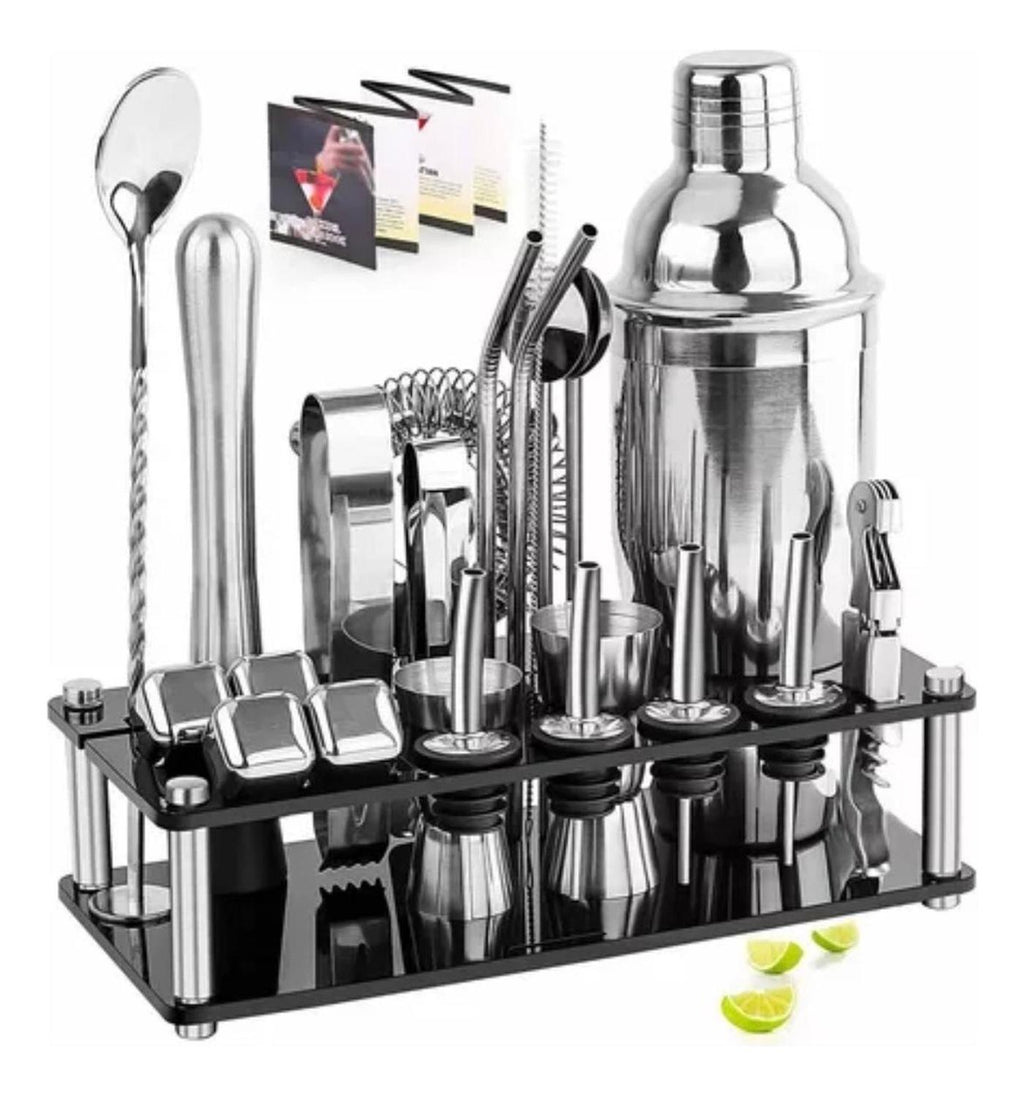El juego completo de 23 piezas de coctelera incluye coctelera de 750 ml / cubitos de hielo de acero inoxidable / paleta triturada / taza medidora / clip para hielo / sacacorchos / vertedor de licor / pajita / colador / tapones / cepillo / cuchara / mezcla Cuchara: Crea cócteles de licor de nivel profesional con confianza, sin importar si eres un bartender experimentado o un principiante.Material de acero inoxidable 304 - el juego de coctelera está hecho de material de acero inoxidable 304 de grado alimenticio, este kit de camarero está engrosado para asegurarse de que no se doblará, romperá, oxidará ni deformará, totalmente duradero para barras de gran volumen. y bares en casa. Uso sostenible durante muchos años.Colador bien diseñado y jigger doble - El colador del filtro está equipado con un resorte de alta densidad, que evita que los fragmentos de hielo o la pulpa de fruta entren en sus bebidas. Con medidas precisas y precisas para 25 y 50 ml, 15 y 30 ml. La coctelera ofrece un excelente sello hermético, ideal para Martini o para batir cócteles como Mojitos y Margaritas. Cubre todas las necesidades que pueda tener de cócteles o bebidas razonables. Cubo de hielo reutilizable - a diferencia de los cubitos de hielo normales, esos cubitos de hielo reutilizables hechos de acero inoxidable pueden darle un suave frío a su bebida sin diluir y no estropearán el sabor. Coloque las piedras de whisky en el congelador durante 4 horas o más. Cuando esté listo, coloque 3-4 cubos en su bebida según sus preferencias personales para enfriar whisky, escocés, bourbon, vodka, vino blanco, etc. Medidas paquete: 40x25x10 cm aprox. Peso: 1 kg. Volumen: 750 ml. Color: Plateado. Material: Metal. Producto 100% recomendado.|Garantía Legal de 6 meses.
