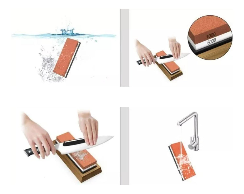 Empape la piedra en el agua durante 5-15 minutos y luego colóquela en una plataforma estable. Afilar los cuchillos en uno o dos pasos depende del grado de Romo de la herramienta.