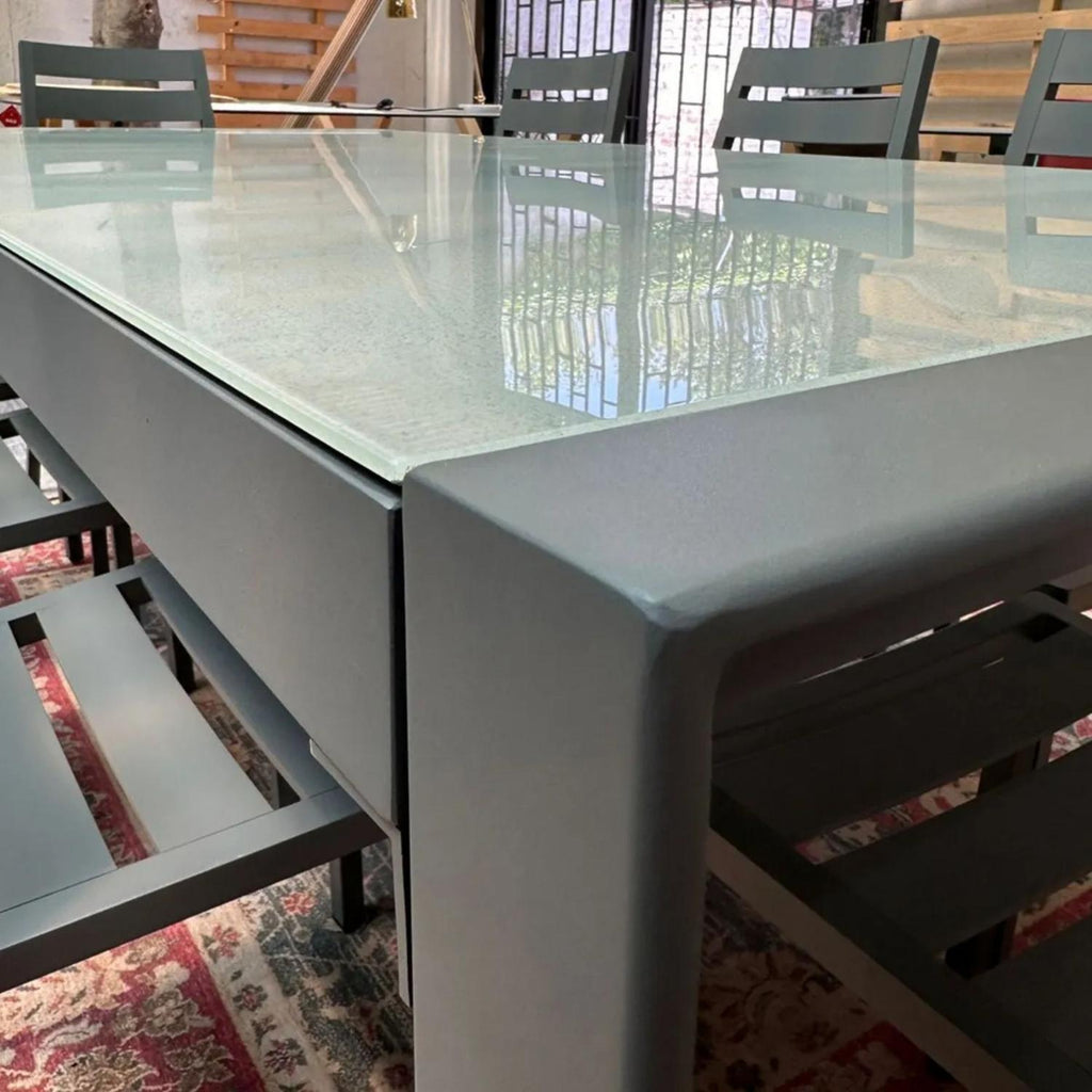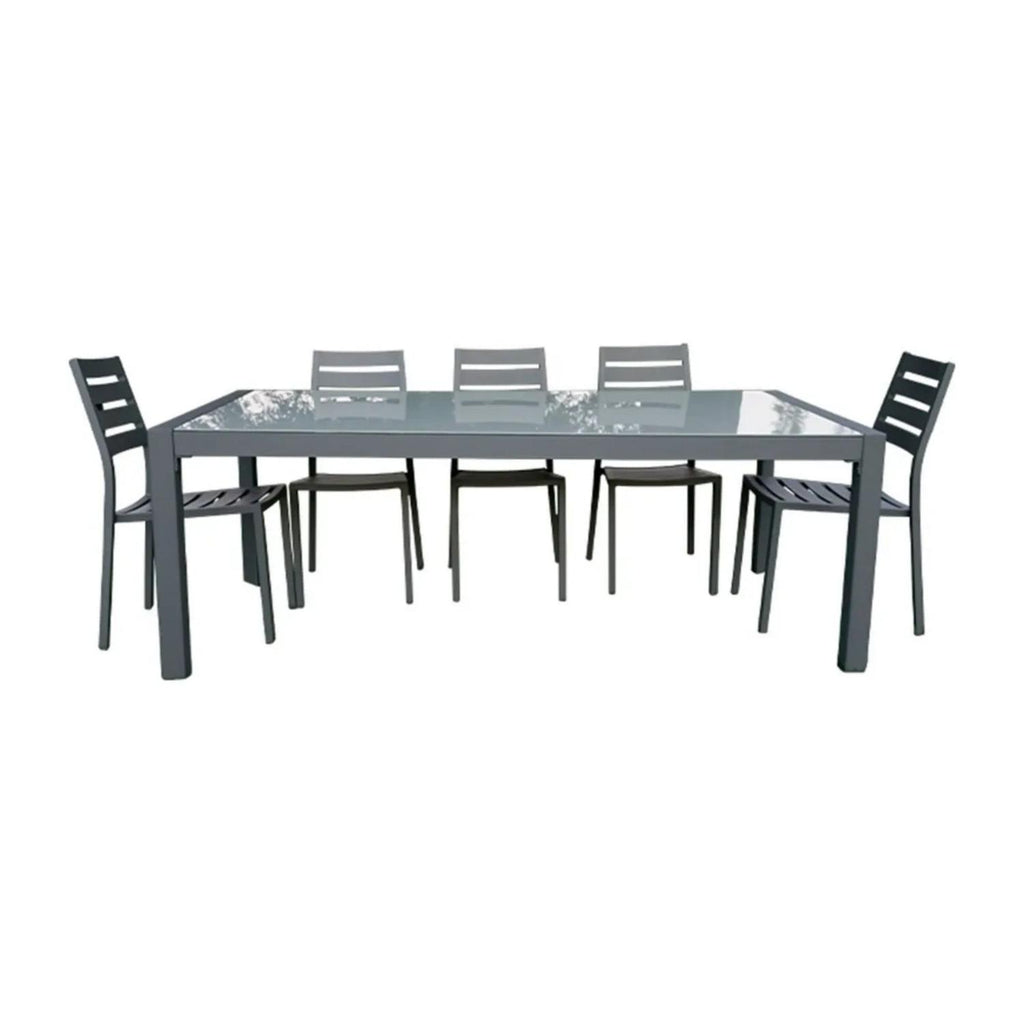 Disfruta de tus reuniones al aire libre con el Juego de Terraza Niza, un conjunto de estilo industrial que combina elegancia, resistencia y confort. Su mesa de aluminio con cubierta de vidrio pintado aporta un toque moderno y sofisticado, mientras que sus 8 sillas de aluminio brindan durabilidad y comodidad. Ideal para compartir comidas o momentos inolvidables en tu jardín, terraza o patio.