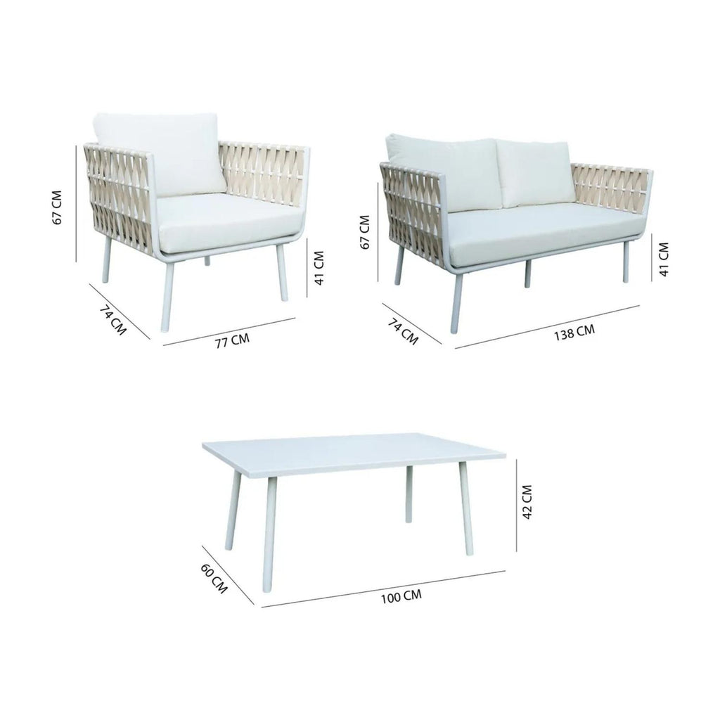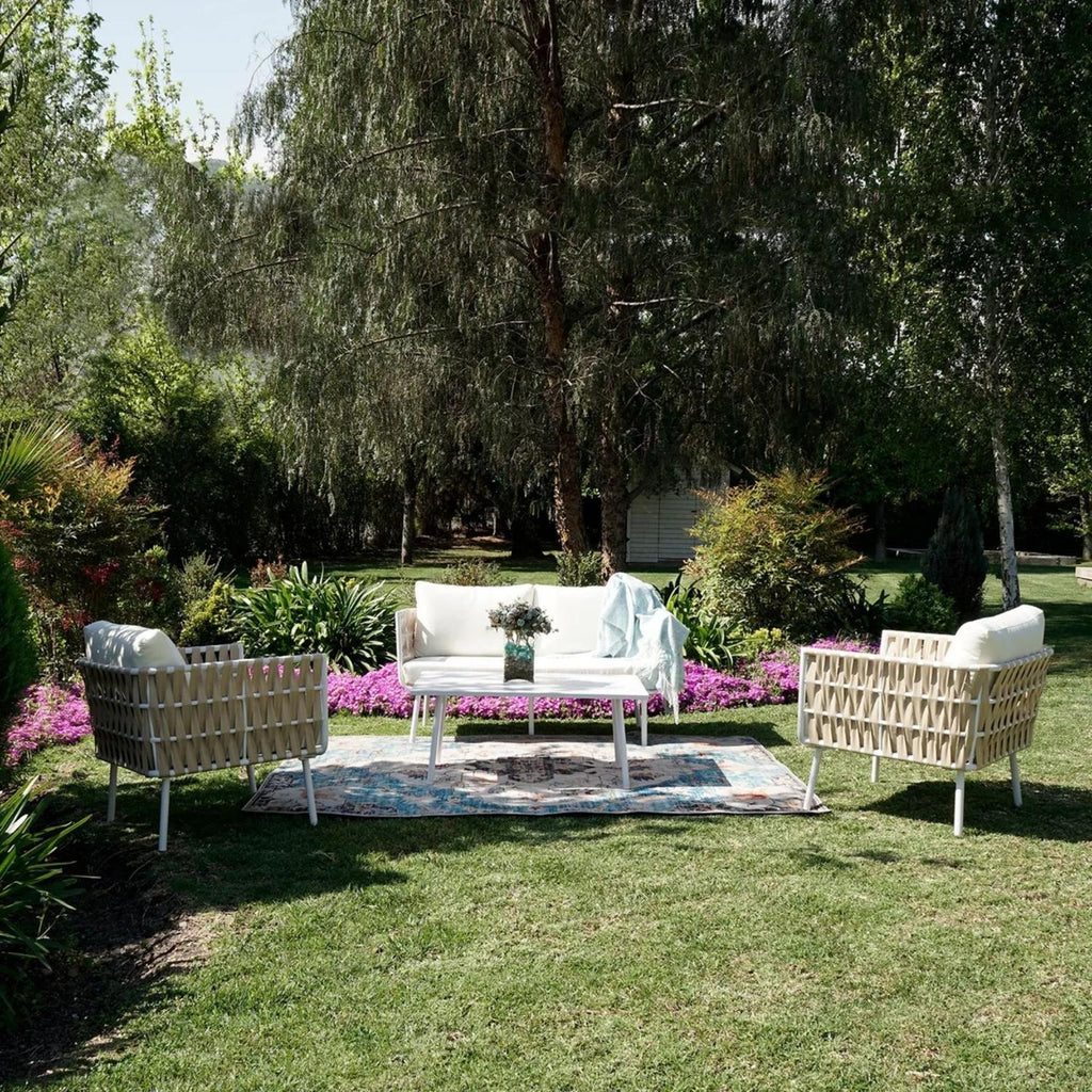 Dale un toque natural y elegante a tu terraza con el Juego de Terraza Marbella, un set que combina comodidad, estilo y resistencia. Su diseño de líneas simples y tonos cálidos crea un ambiente acogedor ideal para disfrutar al aire libre. Fabricado con estructura de aluminio y cintas entrelazadas en respaldos y brazos, ofrece durabilidad y encanto artesanal. Los cojines de poliéster con espuma de secado rápido aseguran confort y fácil mantenimiento, mientras que la mesa de centro de aluminio complementa este conjunto moderno y funcional.