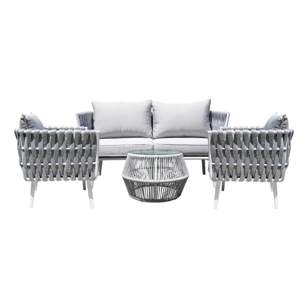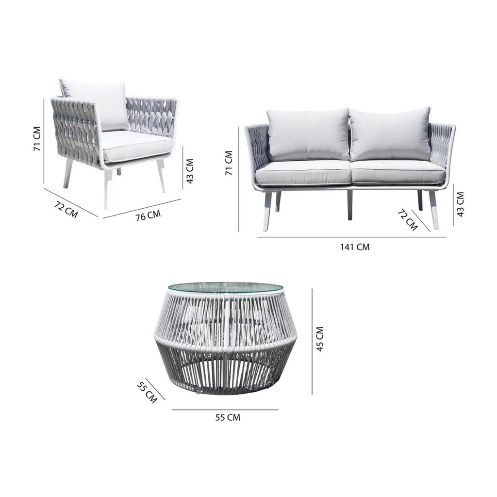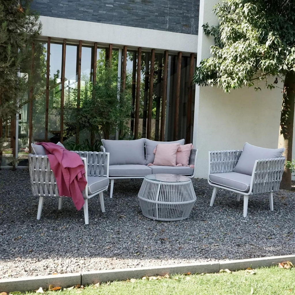 Disfruta de la comodidad y el estilo con el Juego de Terraza Sorrente, una opción moderna y elegante que transformará tus espacios exteriores. Su estructura de aluminio combinada con cuerda entrelazada en respaldos y brazos ofrece resistencia y un diseño sofisticado. Los cojines de poliéster con espuma de secado rápido brindan máximo confort, mientras que la mesa de centro redonda con tapa de vidrio aporta un toque contemporáneo y funcional. Perfecto para terrazas, balcones o jardines.