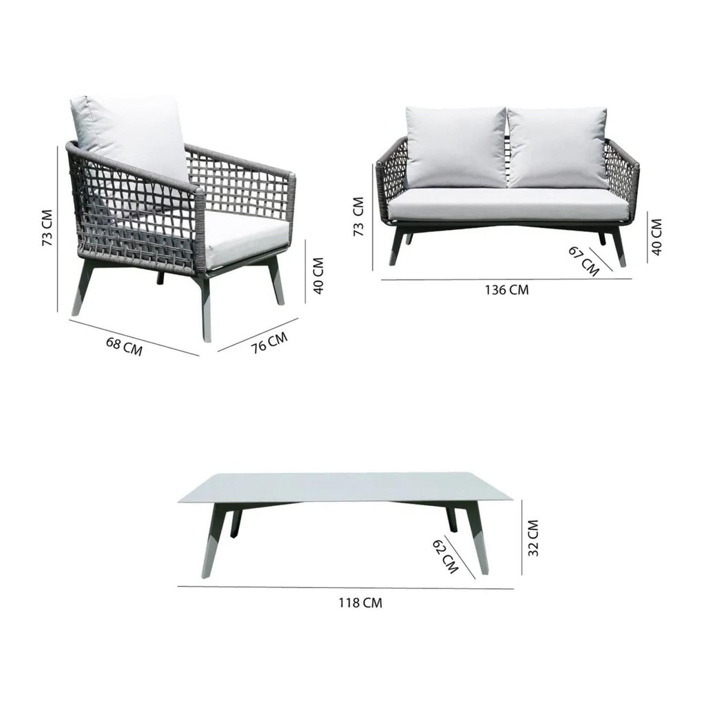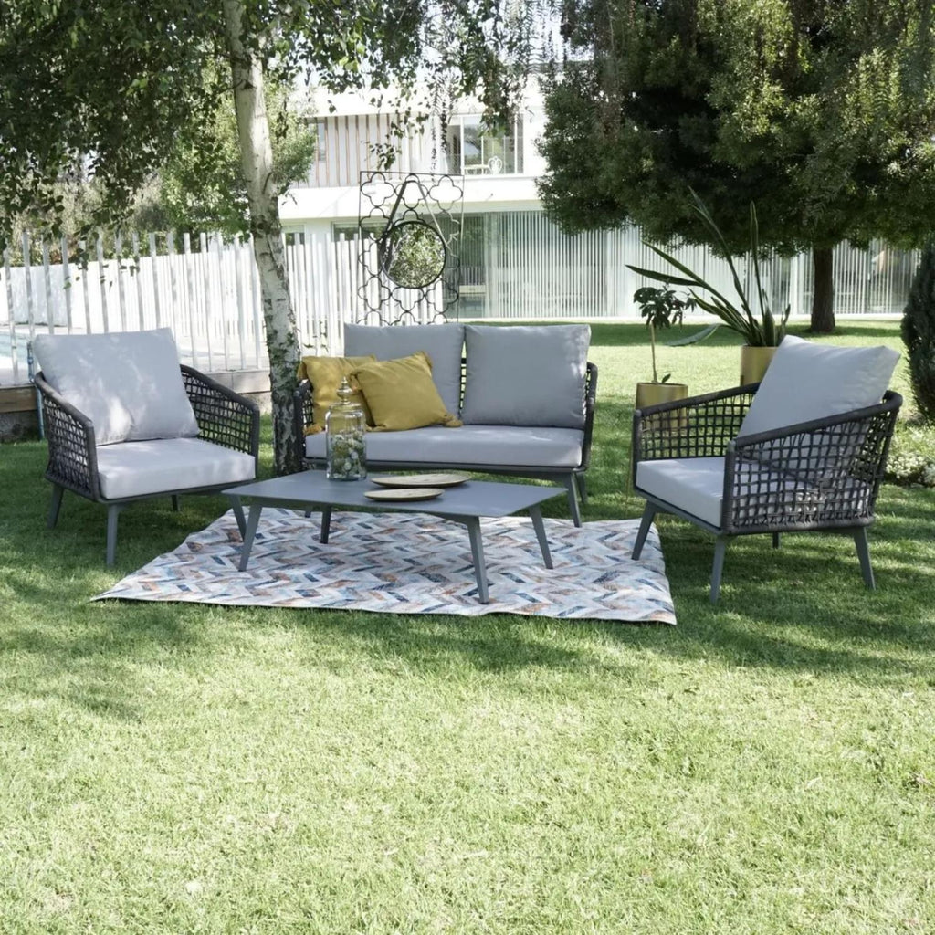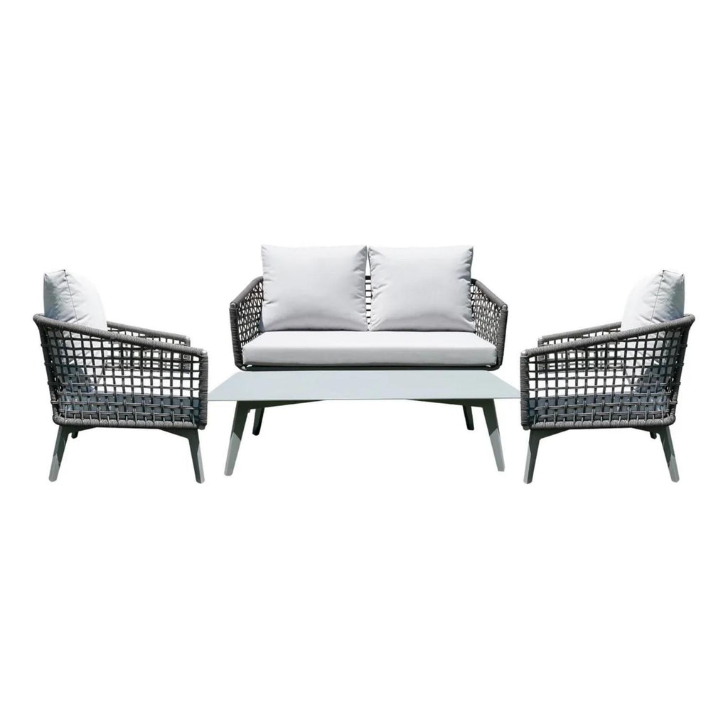 Disfruta de la comodidad y elegancia del Juego de Terraza Lanzarote, un set de estilo contemporáneo que transformará tu espacio exterior en un ambiente sofisticado y acogedor. Su diseño en tonos grises combina a la perfección con la estructura de aluminio y las sogas entrelazadas en respaldos y brazos, brindando resistencia y un toque moderno. Los cojines de poliéster con espuma de secado rápido ofrecen máximo confort y durabilidad, mientras que su mesa de centro de aluminio completa un conjunto ideal para compartir y relajarse al aire libre.