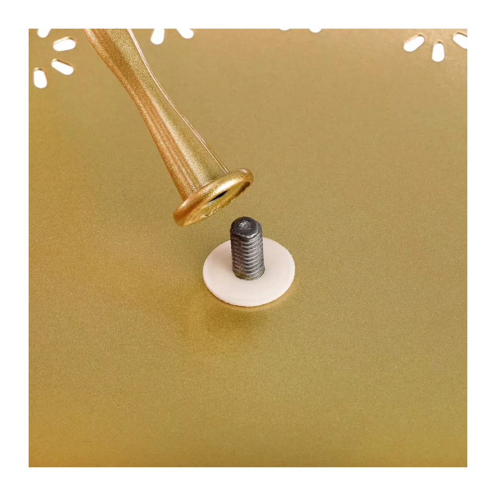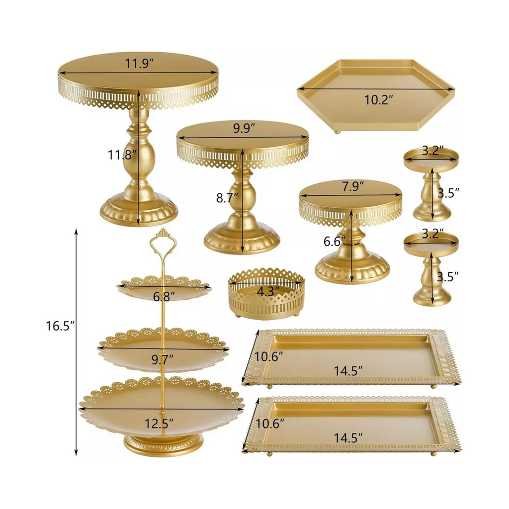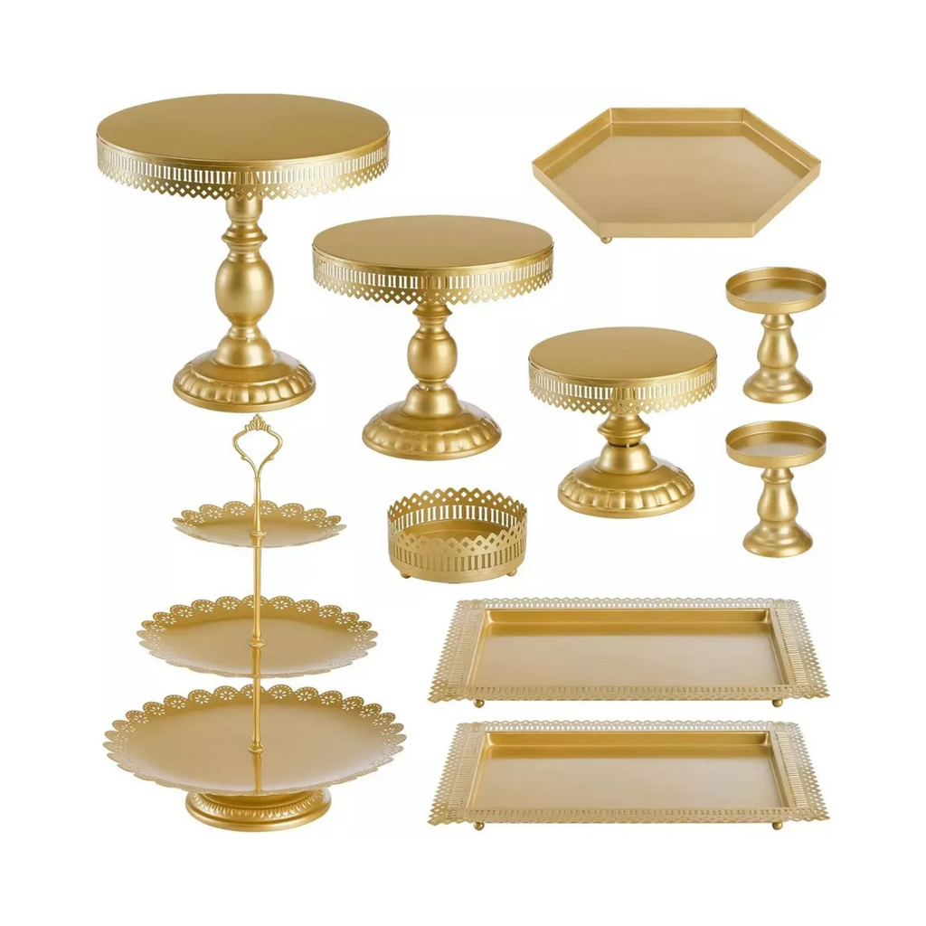 Este kit de 10 porta tortas y cupcakes decorativos en color dorado es perfecto para darle un toque elegante a tus eventos y reuniones. Fabricado en metal de alta calidad, cuenta con un acabado en pintura dorada a base de agua, apta para alimentos, que garantiza durabilidad y resistencia al desgaste, sin perder su brillo ni oxidarse. Su diseño antiguo y sofisticado realza cualquier mesa y es ideal para bodas, baby showers, cumpleaños o decoración del hogar.