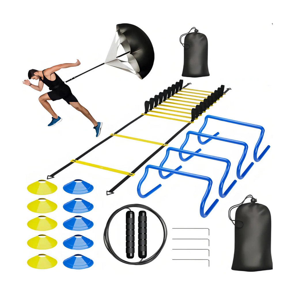 Este kit de entrenamiento es perfecto para mejorar la velocidad, agilidad, coordinación y equilibrio en deportes como fútbol, béisbol y baloncesto. Incluye una escalera de coordinación de 6 metros con 12 peldaños, paracaídas de resistencia, conos tipo lenteja, vallas de agilidad, cuerda para saltar y clavos para fijar la escalera, todo diseñado para satisfacer diversas necesidades de entrenamiento tanto en interiores como exteriores.