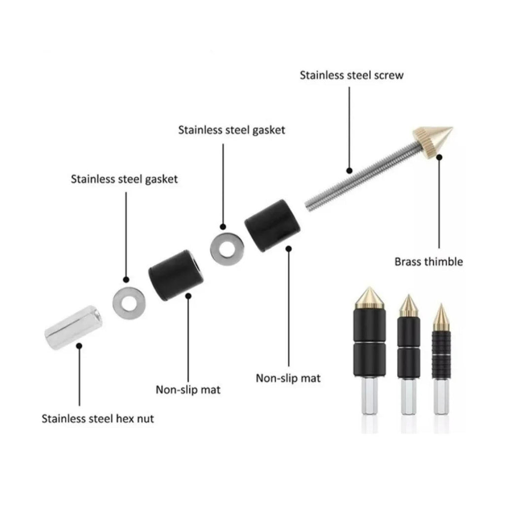 Medidas de las piezas: • aguja de 1.2 cm: 1 x 3 cm • Aguja de 1.7 cm: 1 x 4 cm • Aguja de 2.1 cm: 1 x 5 cm • Cubierta de goma: 6 x 2 x 0.5 cm • Llave en T: 10 x 3 x 1 cm • Recogedor de aguja roscada: 8 x 2 x 2 cm • Medida estimada del empaque: 15 x 10 x 6 cm