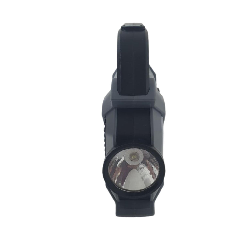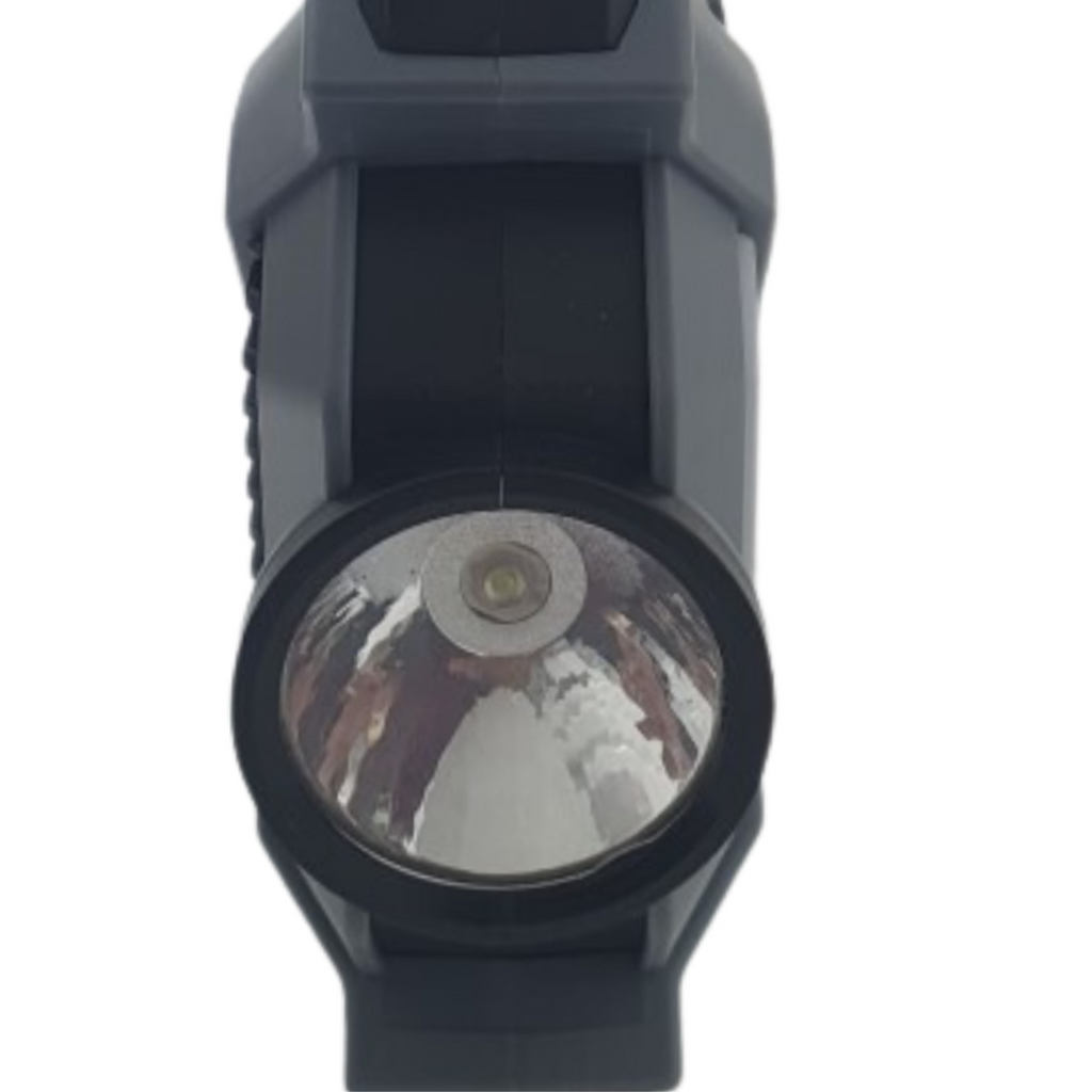 Potente linterna multi propósito, de plástico, disponible en colores negro con gris, verde o azul. Ideal para camping, trabajos en casa o como luz de apoyo.