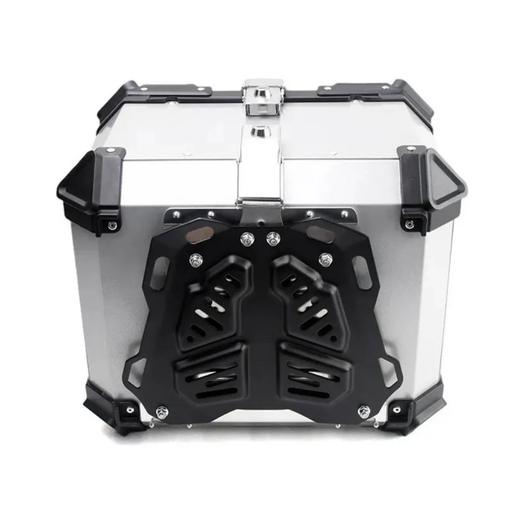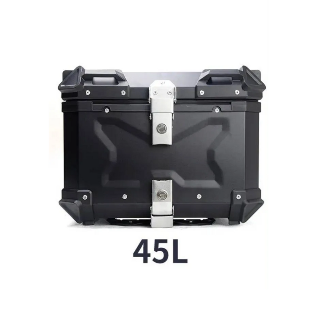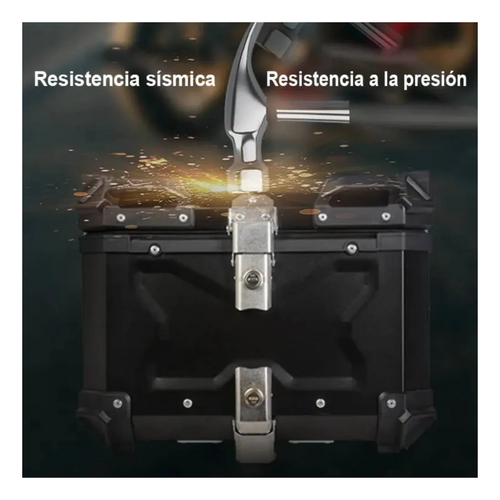Maletero resistente y ligero, fabricado en aleación de aluminio de alta calidad con capacidad para 45 litros. Este maletero ofrece una protección impermeable efectiva contra la lluvia y el polvo, asegurando que tus pertenencias se mantengan seguras y secas durante tus viajes o uso diario. Su diseño robusto incluye remaches de acero inoxidable que aumentan su durabilidad y resistencia al agua.