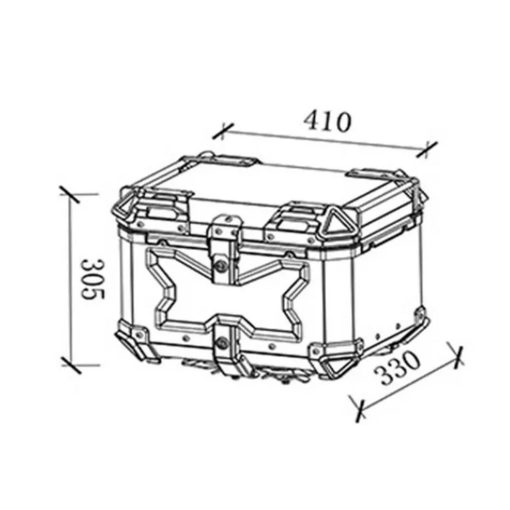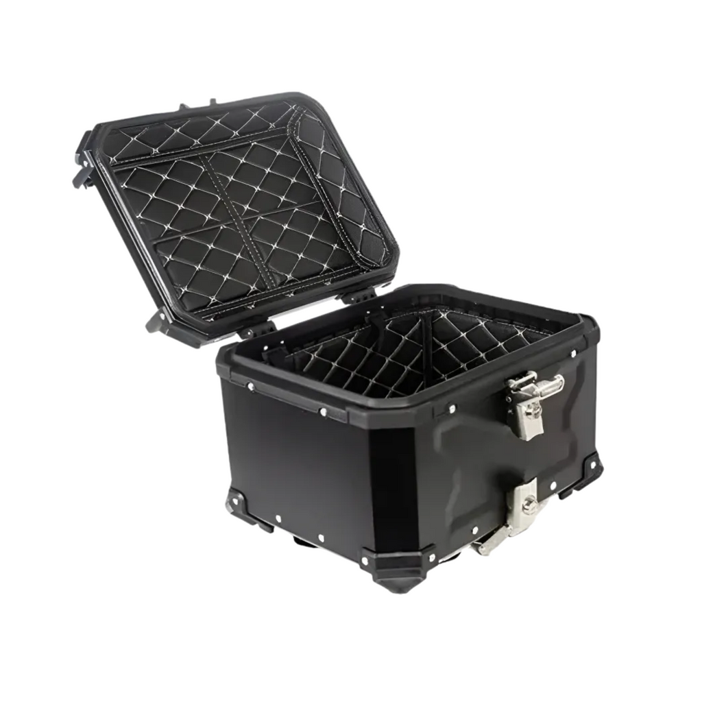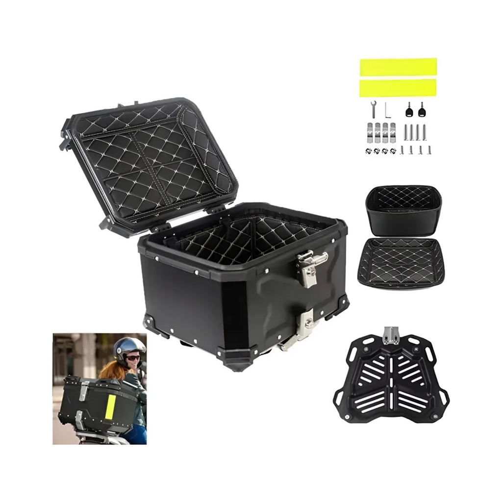 Maletero resistente y ligero, fabricado en aleación de aluminio de alta calidad con capacidad para 45 litros. Este maletero ofrece una protección impermeable efectiva contra la lluvia y el polvo, asegurando que tus pertenencias se mantengan seguras y secas durante tus viajes o uso diario. Su diseño robusto incluye remaches de acero inoxidable que aumentan su durabilidad y resistencia al agua.