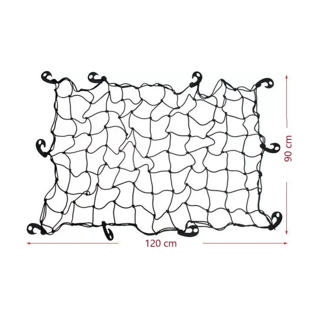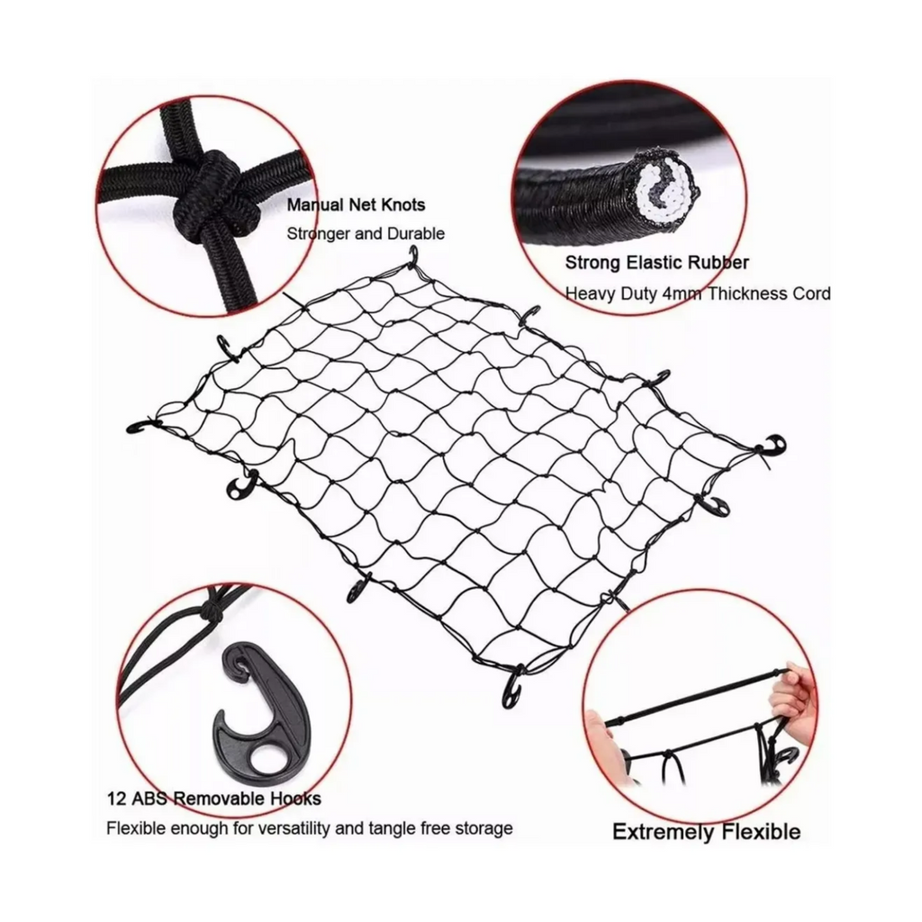 Gracias a sus 12 ganchos ABS, se instala fácilmente sin herramientas ni riesgos de oxidación o rayaduras. Su diseño ajustable permite asegurar tanto cargas pequeñas como grandes, ofreciendo máxima sujeción incluso en condiciones extremas. Además, incluye una práctica bolsa de almacenamiento con cierre para llevarla donde la necesites.