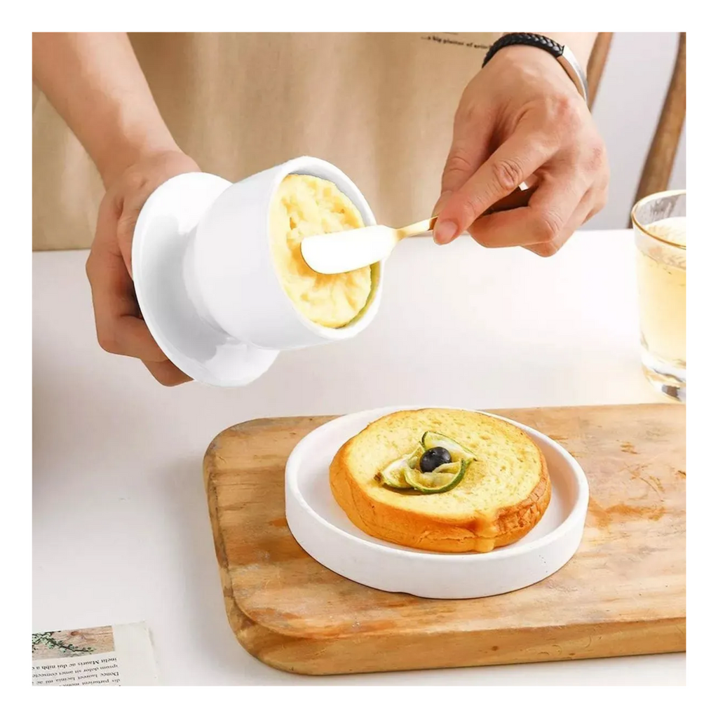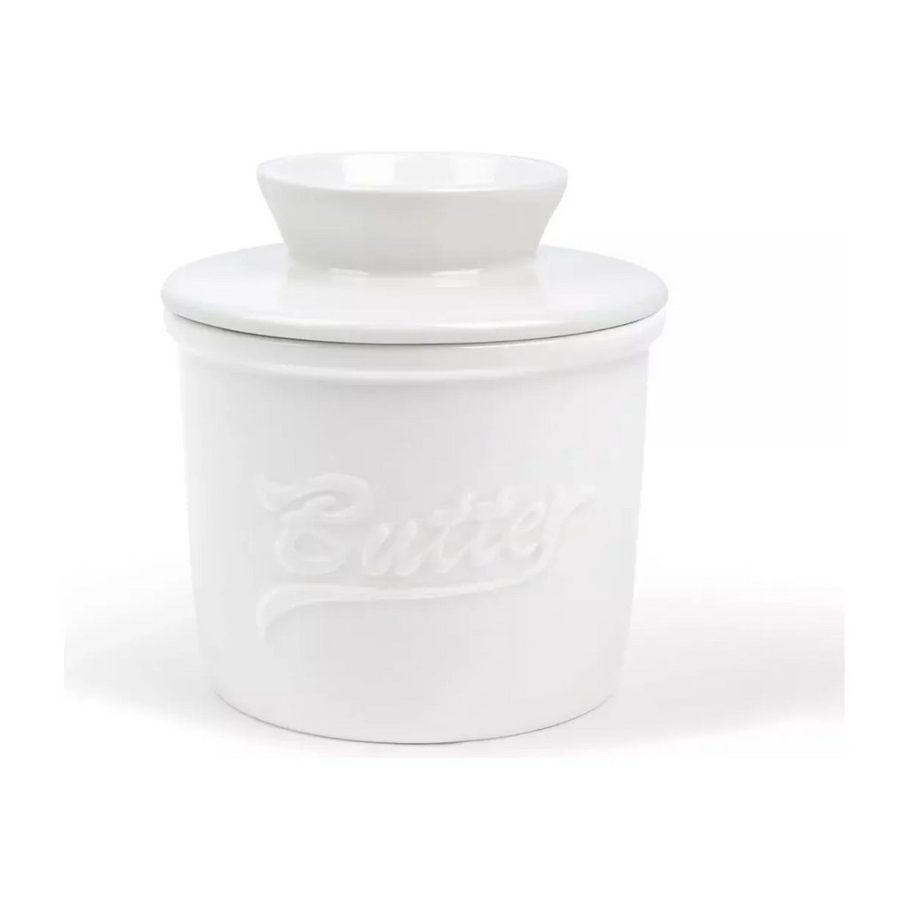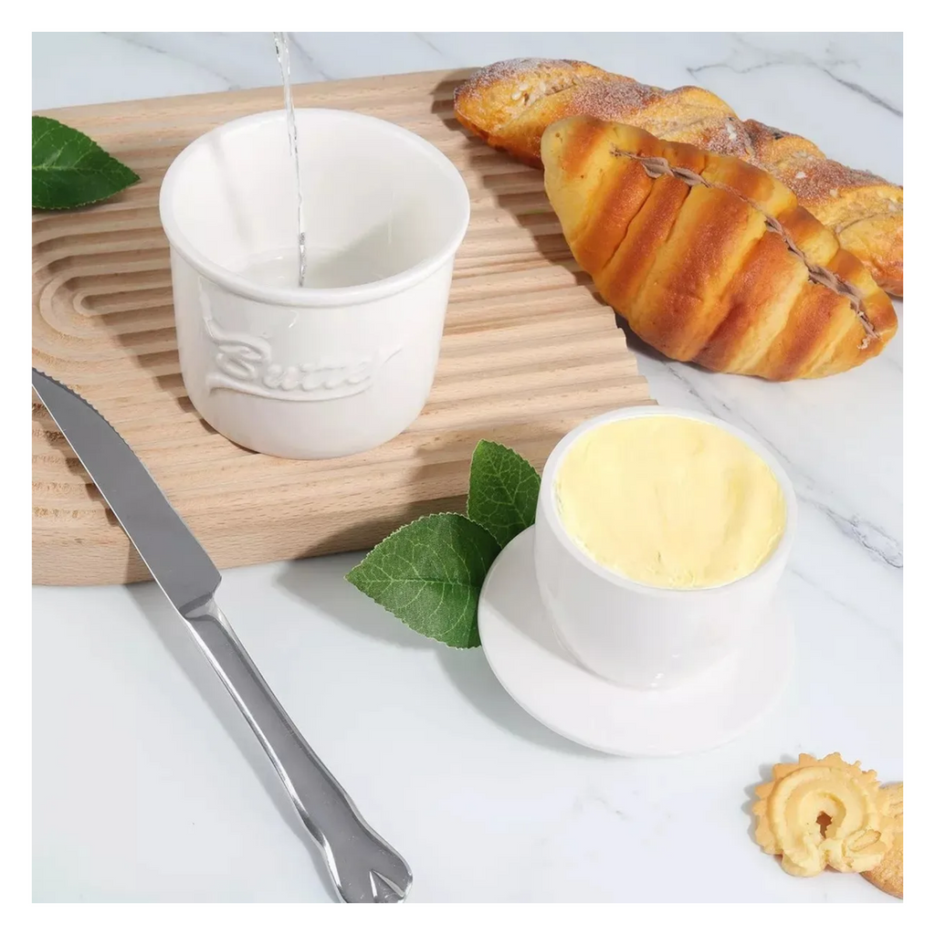 Disfruta de mantequilla siempre fresca y lista para untar con esta elegante mantequillera francesa de cerámica blanca. Su diseño clásico utiliza agua para crear un sello hermético natural que conserva la mantequilla a temperatura ambiente sin necesidad de refrigeración. Perfecta para mantener la textura suave y el sabor original de tu mantequilla.
