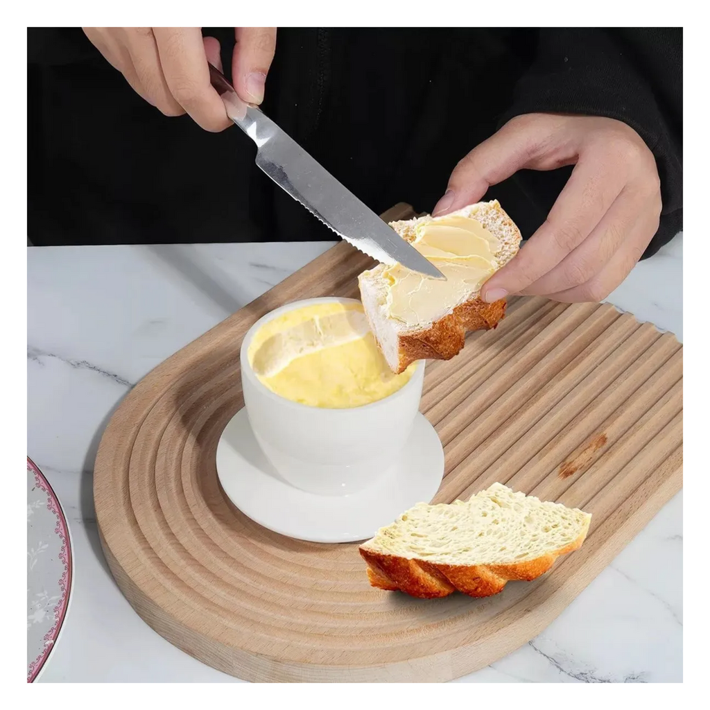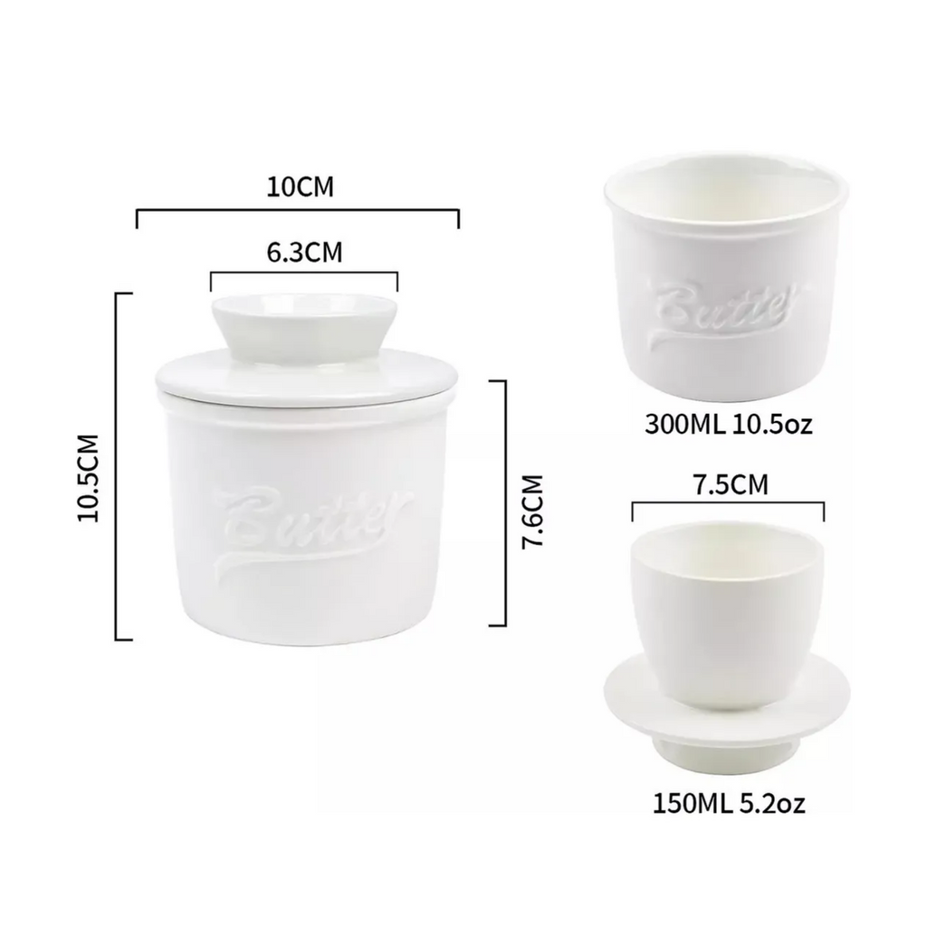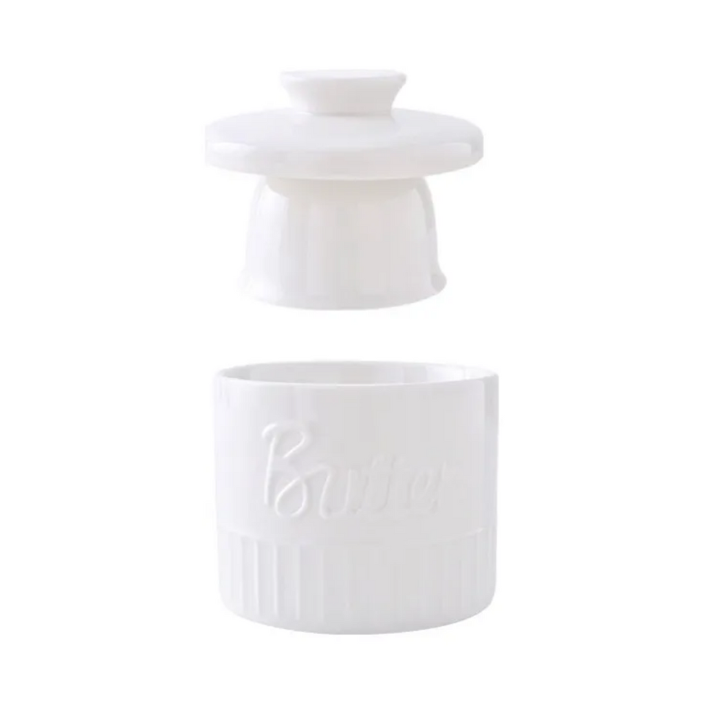 Disfruta de mantequilla siempre fresca y lista para untar con esta elegante mantequillera francesa de cerámica blanca. Su diseño clásico utiliza agua para crear un sello hermético natural que conserva la mantequilla a temperatura ambiente sin necesidad de refrigeración. Perfecta para mantener la textura suave y el sabor original de tu mantequilla.