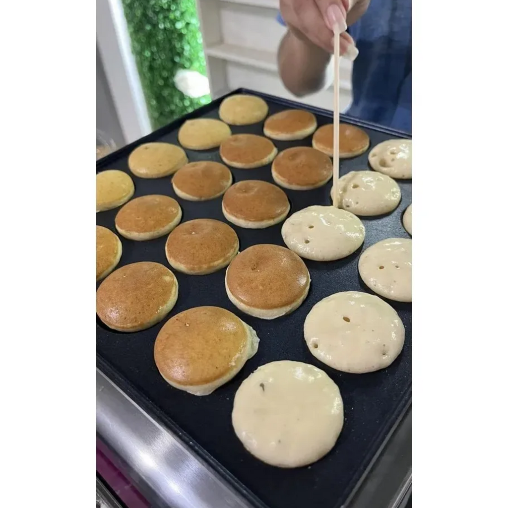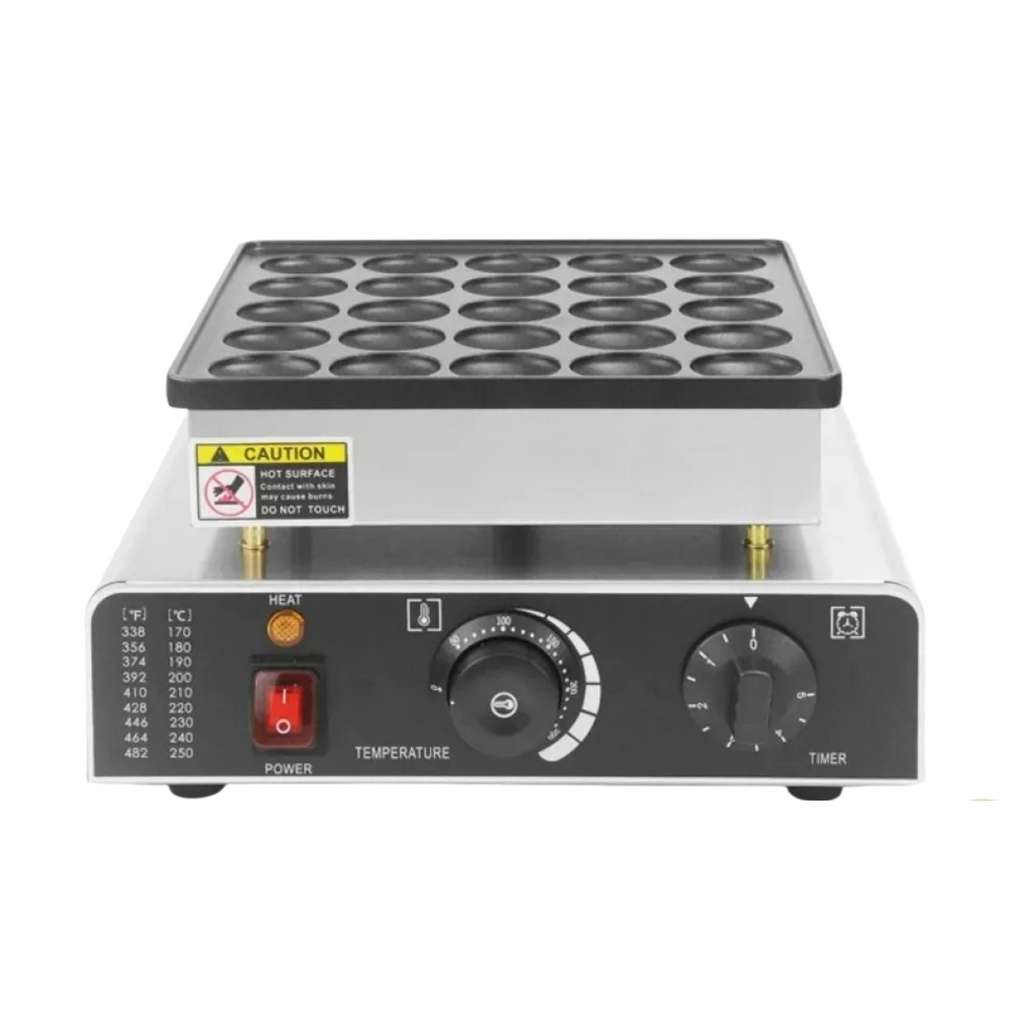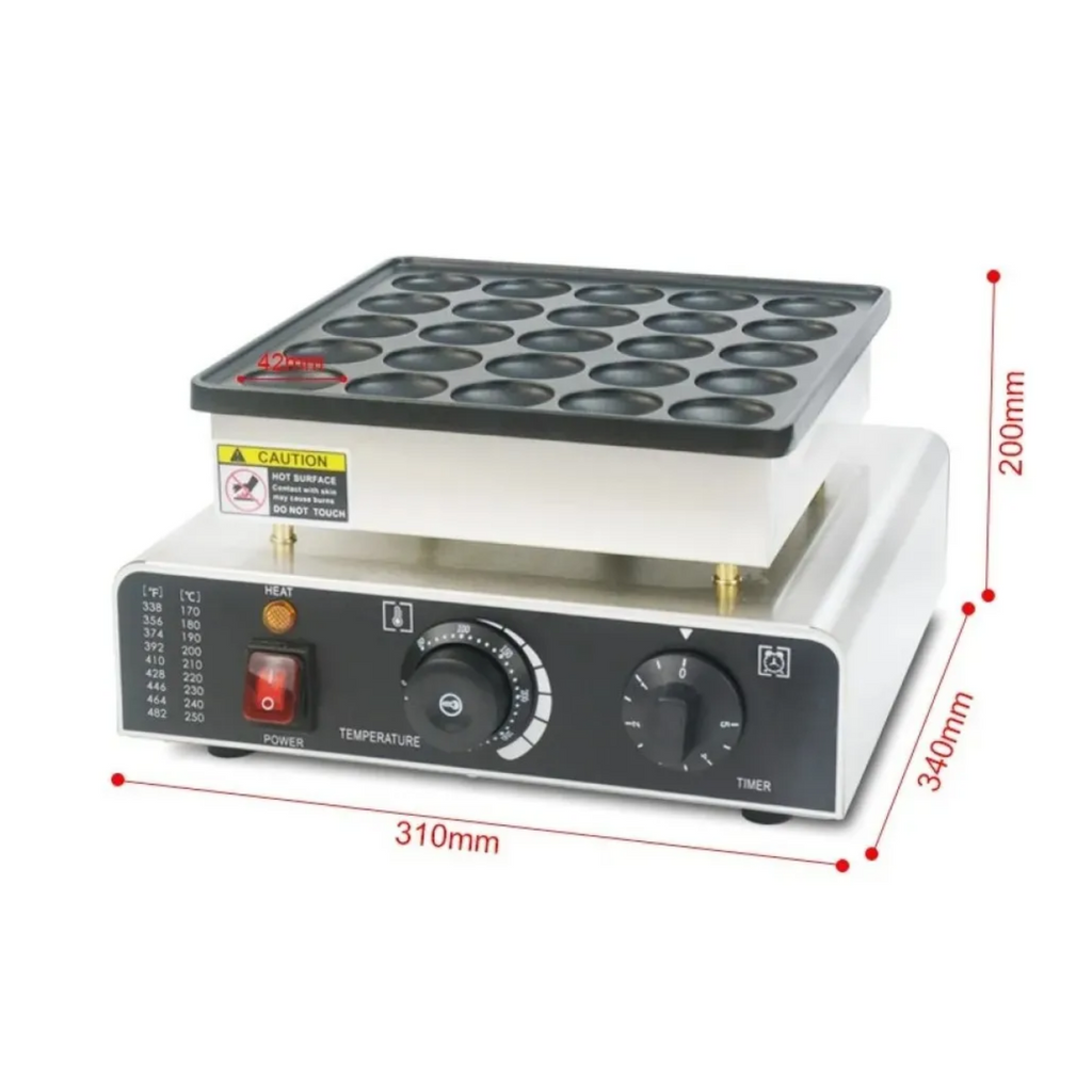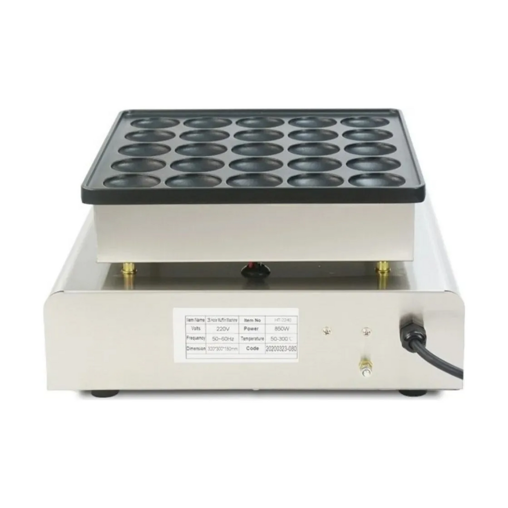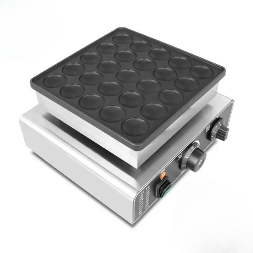 La Máquina Minihotcakes Eléctrica de 25 Piezas y 850 W es ideal para preparar gofres y conos de manera rápida y uniforme. Su control de tiempo y temperatura mediante perillas ajustables permite seleccionar de 0 a 5 minutos y de 50 a 300 °C, con luz LED indicadora y alarma melodiosa que avisa cuando los gofres están listos. Las bandejas antiadherentes permiten obtener conos grandes y esponjosos de 42 mm de diámetro, manteniendo la limpieza y facilitando su manejo.