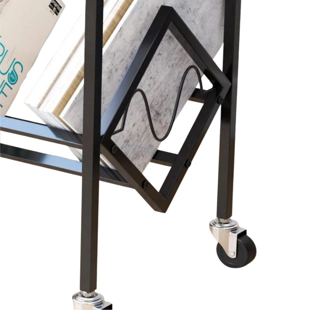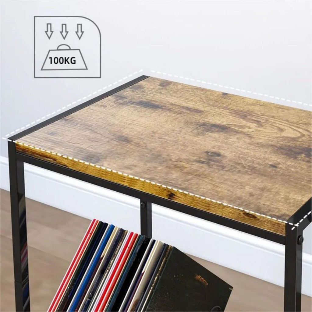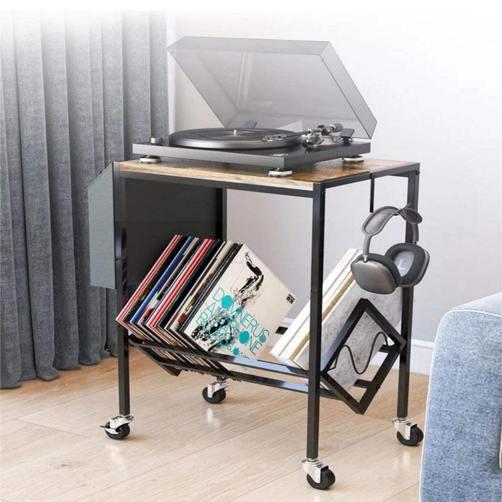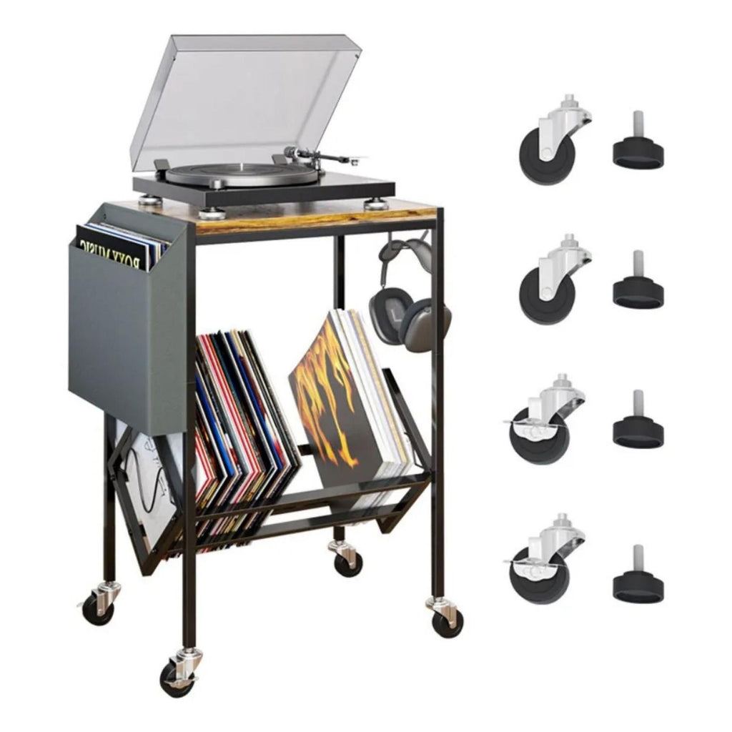 Esta mesa soporte de doble capa es perfecta para organizar y exhibir tu colección de vinilos y tu tocadiscos. Fabricada en metal resistente y equipada con ruedas, permite almacenar múltiples discos de manera ordenada y trasladar fácilmente la unidad a cualquier espacio.