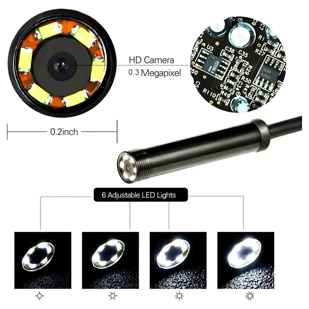 Equipada con visión nocturna, esta cámara garantiza imágenes claras incluso en condiciones de poca luz, brindándote seguridad y comodidad las 24 horas del día. Con un diámetro de lente de 6 mm y cable de 5 metros, podrás acceder a espacios estrechos y realizar inspecciones precisas de manera sencilla y confiable.