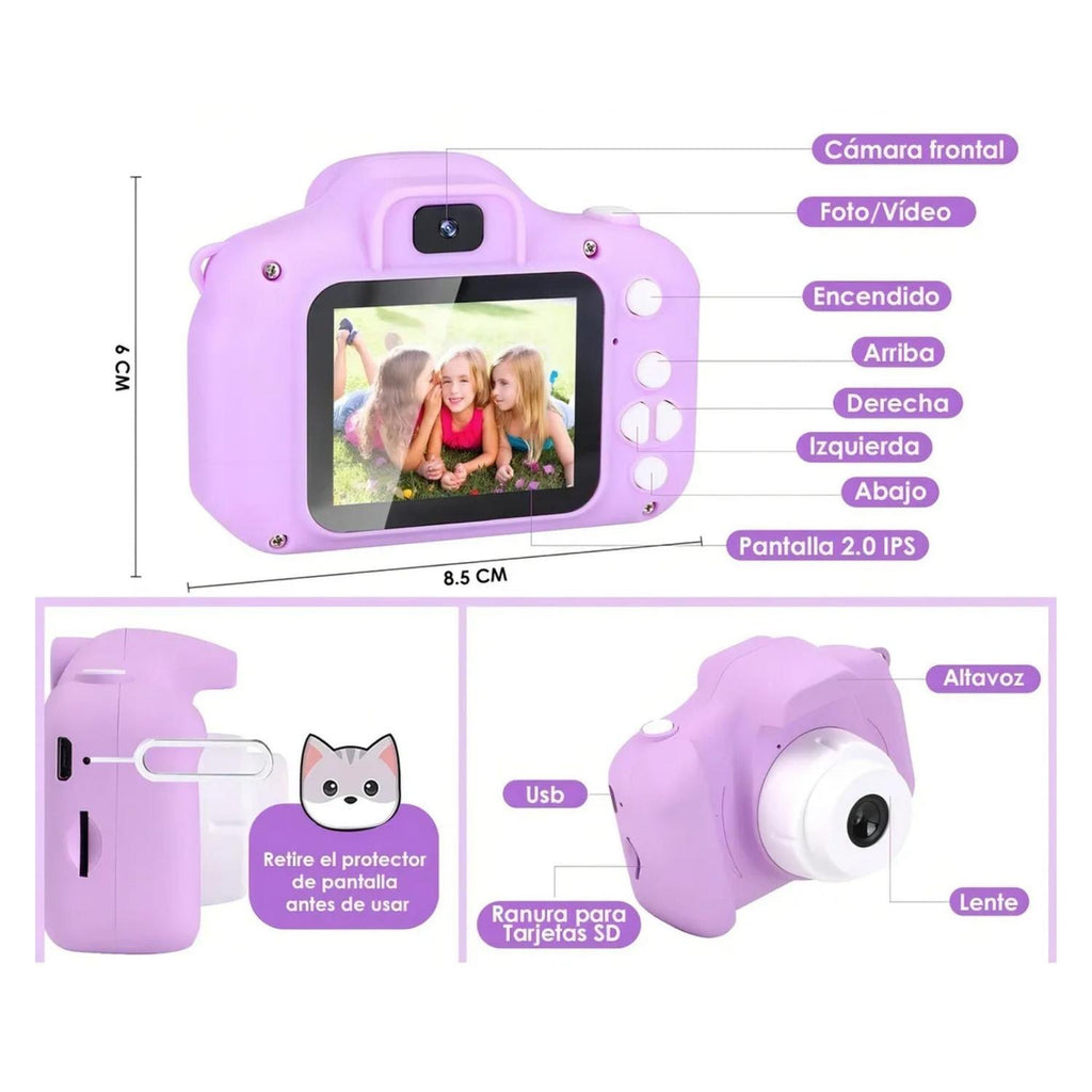 Incluye batería recargable de 600 mAh que permite 3-5 horas de uso continuo, tarjeta SD de 32GB, lector de tarjetas, cordón para colgar la cámara y cable USB para cargar y transferir archivos. También incorpora juegos de puzzle como Serpiente, Sokoban y Tetris, ofreciendo entretenimiento adicional mientras los niños desarrollan su creatividad. Fabricada con materiales duraderos y ecológicos con carcasa de silicona a prueba de golpes para mayor seguridad.