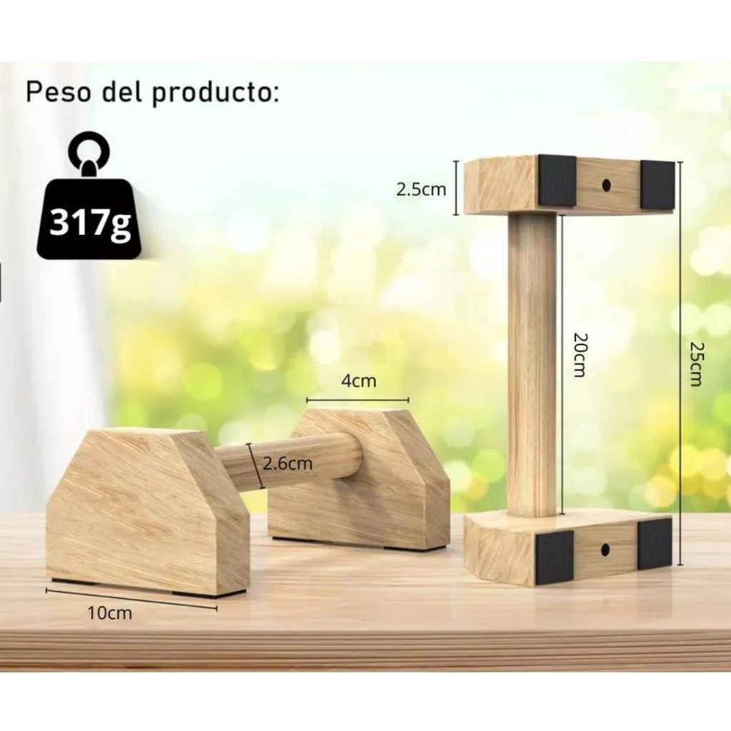 Fabricadas en madera de alta calidad, ofrecen una sensación natural al tacto y un excelente agarre, incluso durante entrenamientos intensos. Gracias a su tamaño de 25 cm de largo por 10 cm de altura, son fáciles de transportar y almacenar. Incluyen una bolsa para llevarlas cómodamente a donde vayas, convirtiéndolas en el complemento ideal para tus entrenamientos en casa, parque o gimnasio.