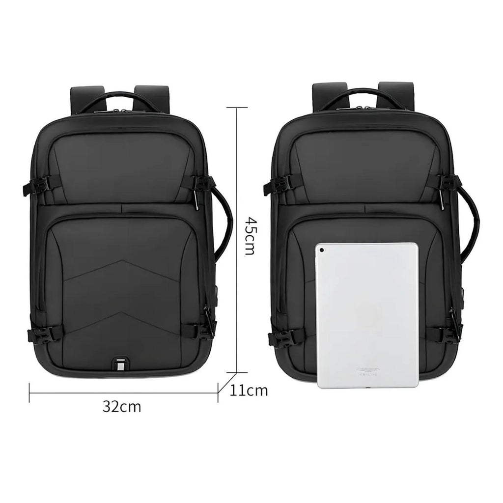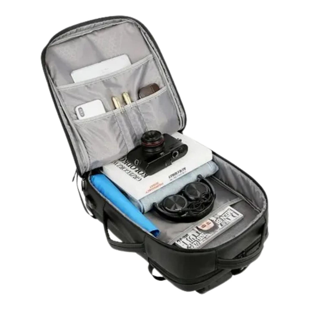 Con compartimentos inteligentes, esta mochila cuenta con 3 bolsillos principales y 6 interiores, con espacio suficiente para portátiles de hasta 15,6 pulgadas, tablets, ropa, libros y accesorios. Además, incorpora puerto USB externo con cable incluido, lo que te permite cargar tus dispositivos fácilmente mientras viajas. Moderna, elegante y funcional, es la opción perfecta tanto para estudiantes como para profesionales y viajeros frecuentes.