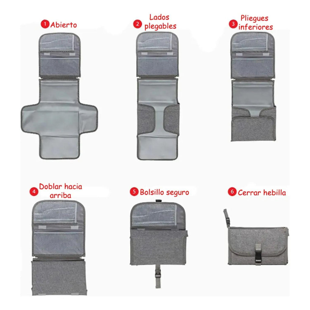 Este cambiador portátil impermeable es el aliado perfecto para los padres en movimiento. Con bolsillos de almacenamiento amplios, ofrece espacio para llevar todo lo necesario durante el cambio de pañal. Su diseño con almohadilla integrada para la cabeza brinda soporte adicional y comodidad para tu bebé. Se pliega fácilmente hasta alcanzar un tamaño compacto, ideal para llevar en el bolso o mochila.