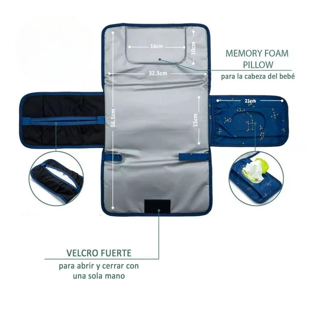 Este mudador cambiador plegable para bebé en color azul es ideal para llevar a cualquier parte. Su diseño compacto y ligero permite transportarlo fácilmente en un bolso o mochila, siendo perfecto para cambiar pañales en movimiento. Cuenta con un sistema de triple capa: una superficie de poliéster, una capa intermedia de esponja para mayor comodidad y una base impermeable que evita filtraciones, protegiendo al bebé y manteniendo todo limpio.