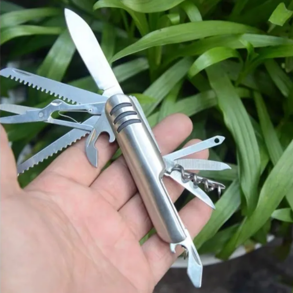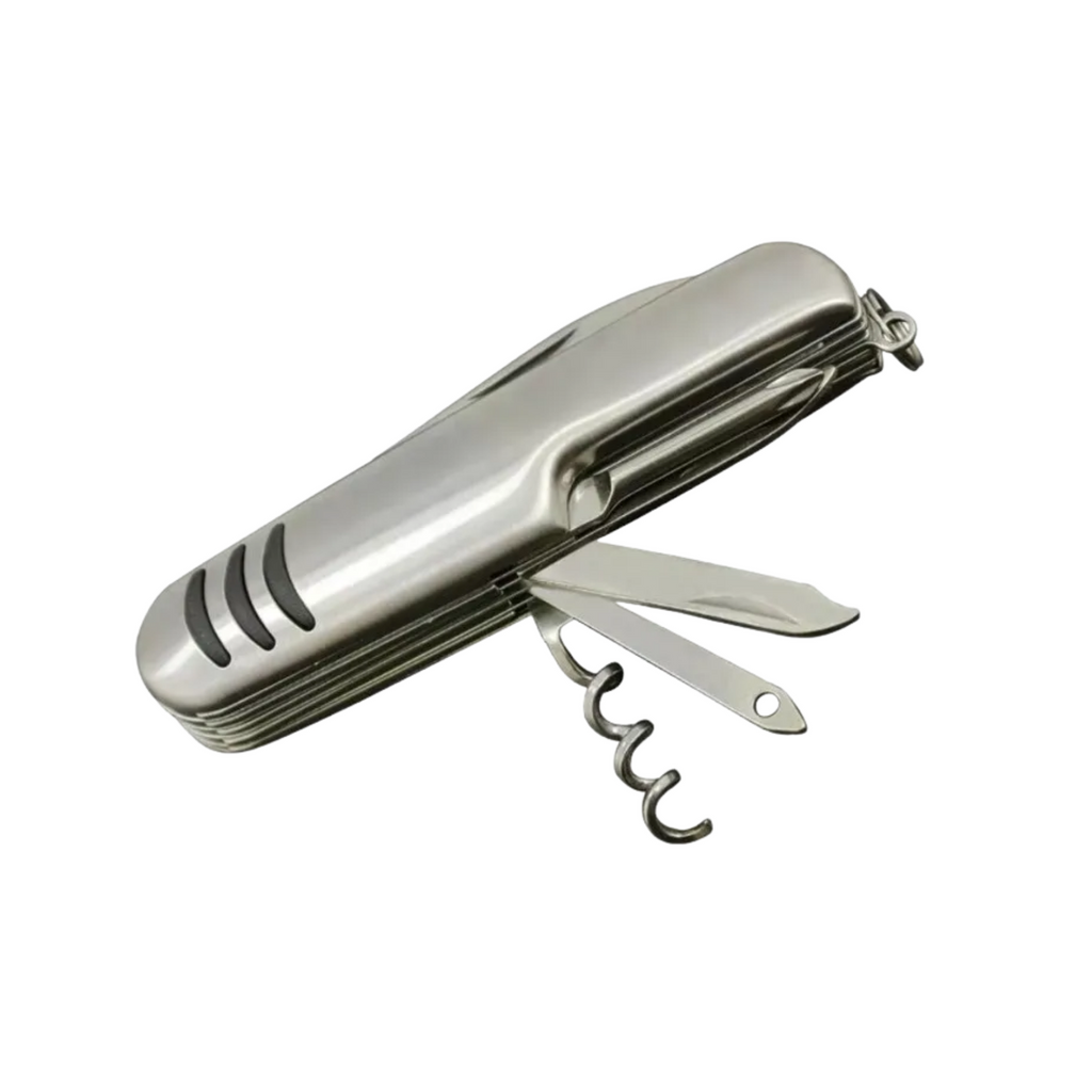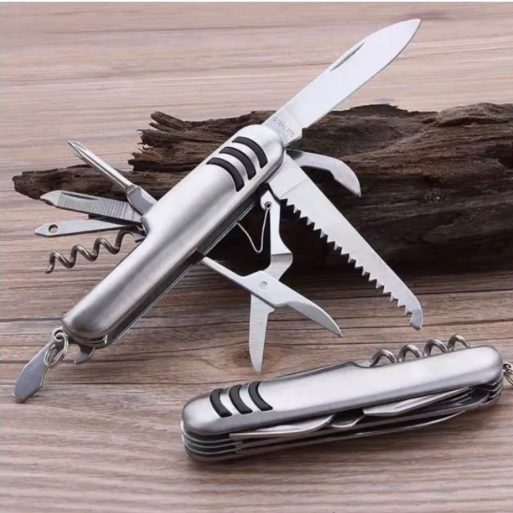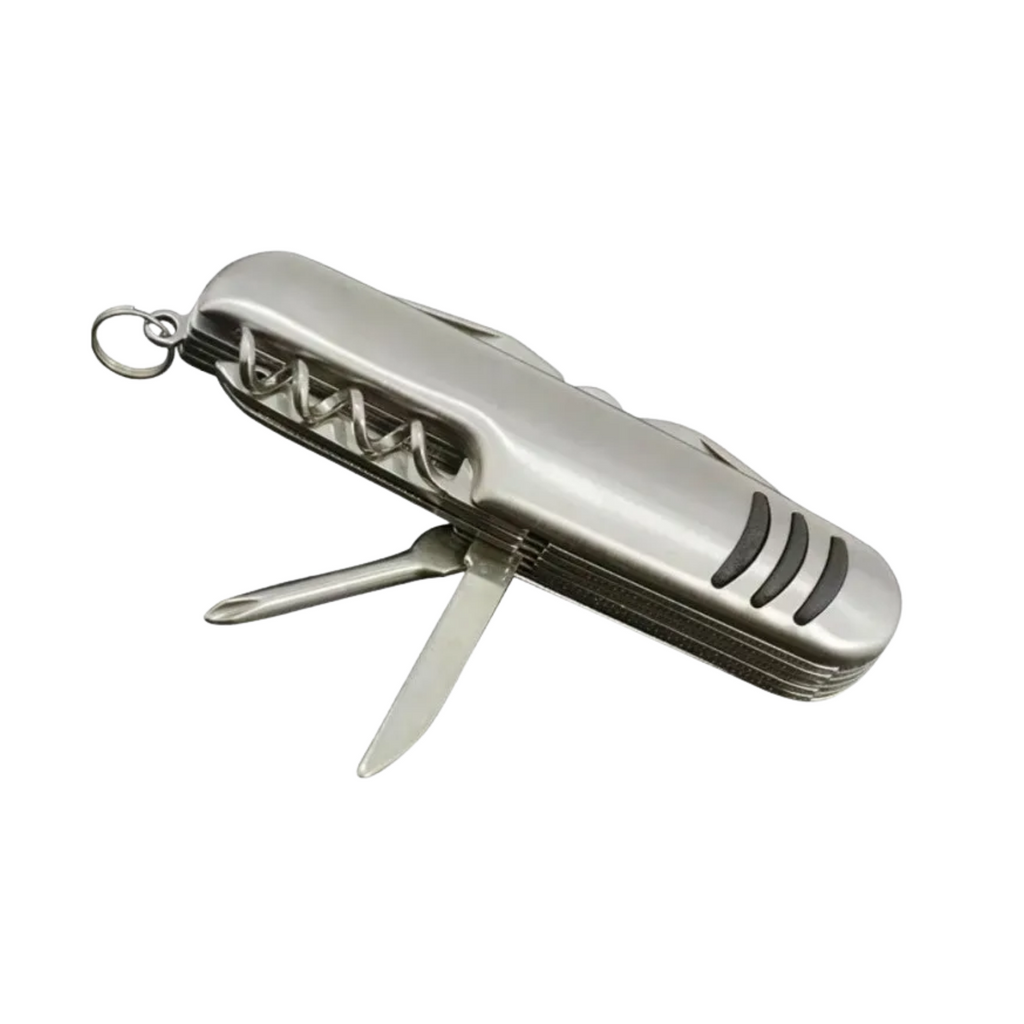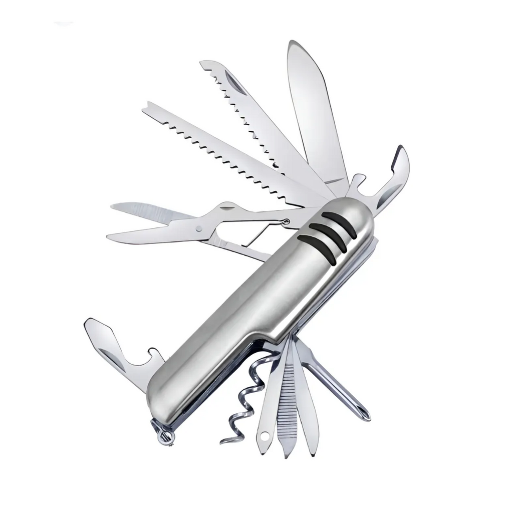 Navaja Suiza cortaplumas multiuso plateado, diseñada para ser una herramienta práctica y compacta para diversas tareas diarias. Su acabado plateado le da un aspecto elegante y resistente. Ideal para llevar en actividades al aire libre, trabajos manuales o uso cotidiano, gracias a su variedad de funciones que facilitan desde cortar hasta abrir botellas o realizar reparaciones simples.
