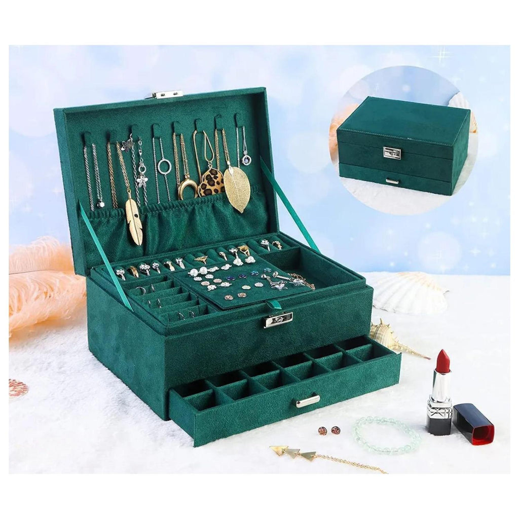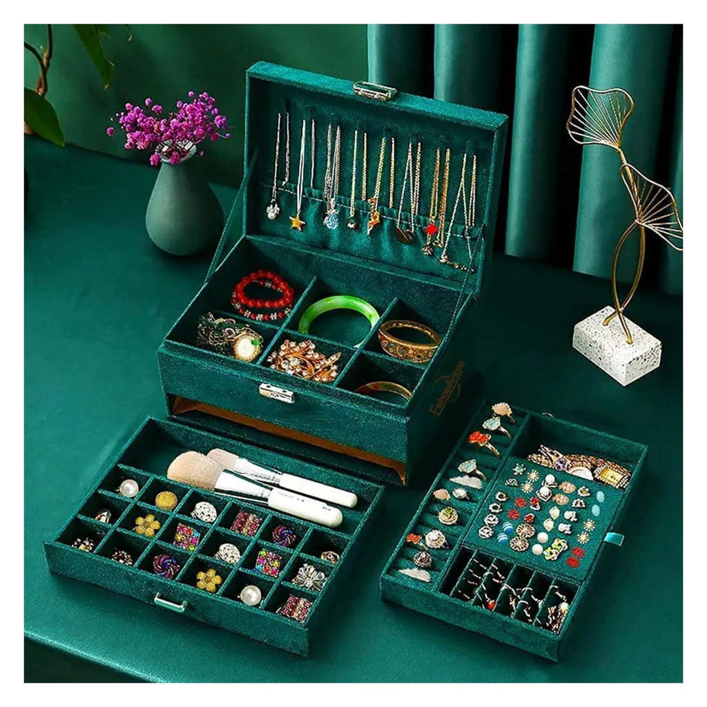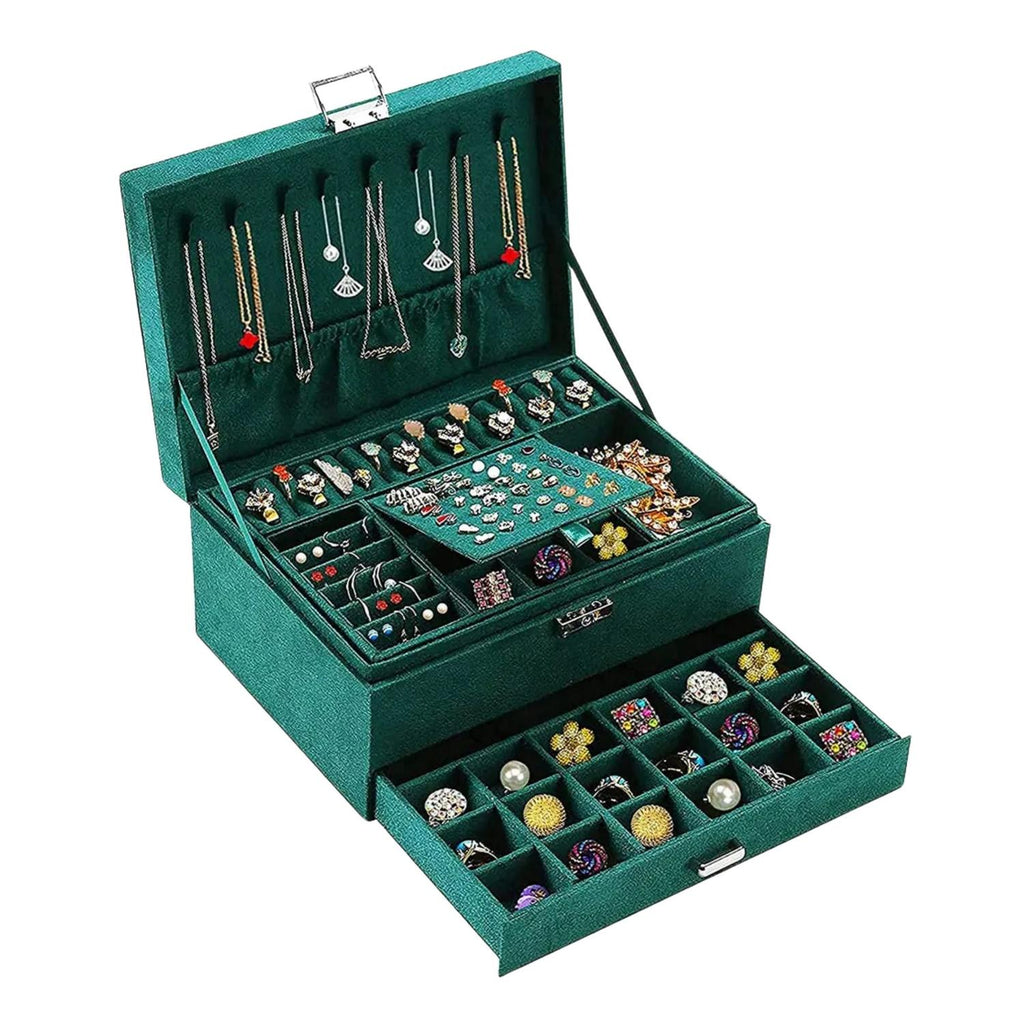 Con medidas de 24 cm de largo, 17 cm de ancho y 11 cm de alto, este joyero incluye tres capas: una superior con 8 ganchos para collares y múltiples ranuras para anillos y aretes, una capa media con rejillas grandes para pulseras y relojes, y una capa inferior con compartimentos para brochas y anillos. Además, incorpora una llave para asegurar tus objetos de valor. Producto 100% recomendado con garantía legal de 6 meses.