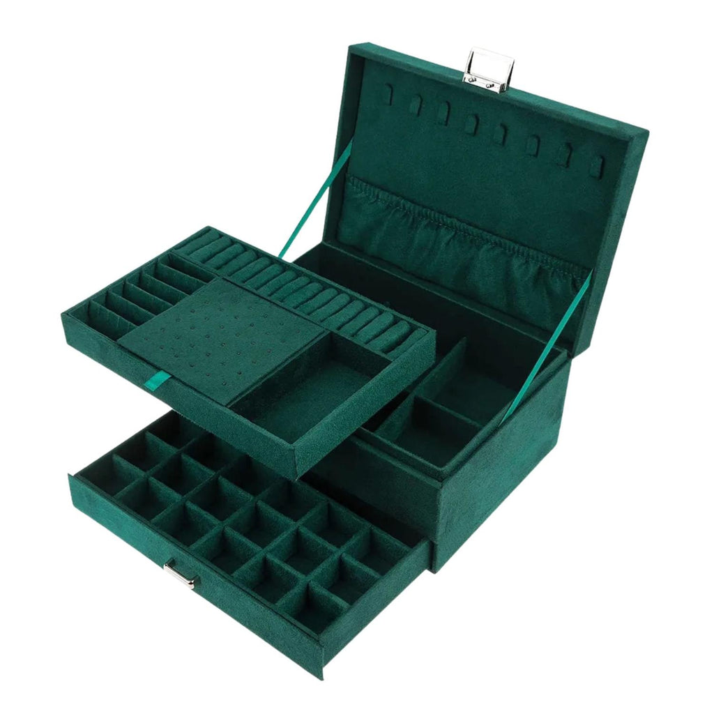 Este organizador de joyas multiusos de 2 niveles es ideal para mantener tus accesorios siempre ordenados y protegidos. Fabricado en tela de gamuza natural, un material resistente al desgaste y ecológico, este joyero vintage combina funcionalidad y estilo. Su diseño con múltiples capas y compartimentos te permite almacenar collares, anillos, aretes, pulseras, relojes y brochas de maquillaje de forma organizada y accesible. Cuenta con ganchos, ranuras y espacios especialmente diseñados para cada tipo de joya, además de divisores desmontables para adaptar el espacio a tus necesidades.