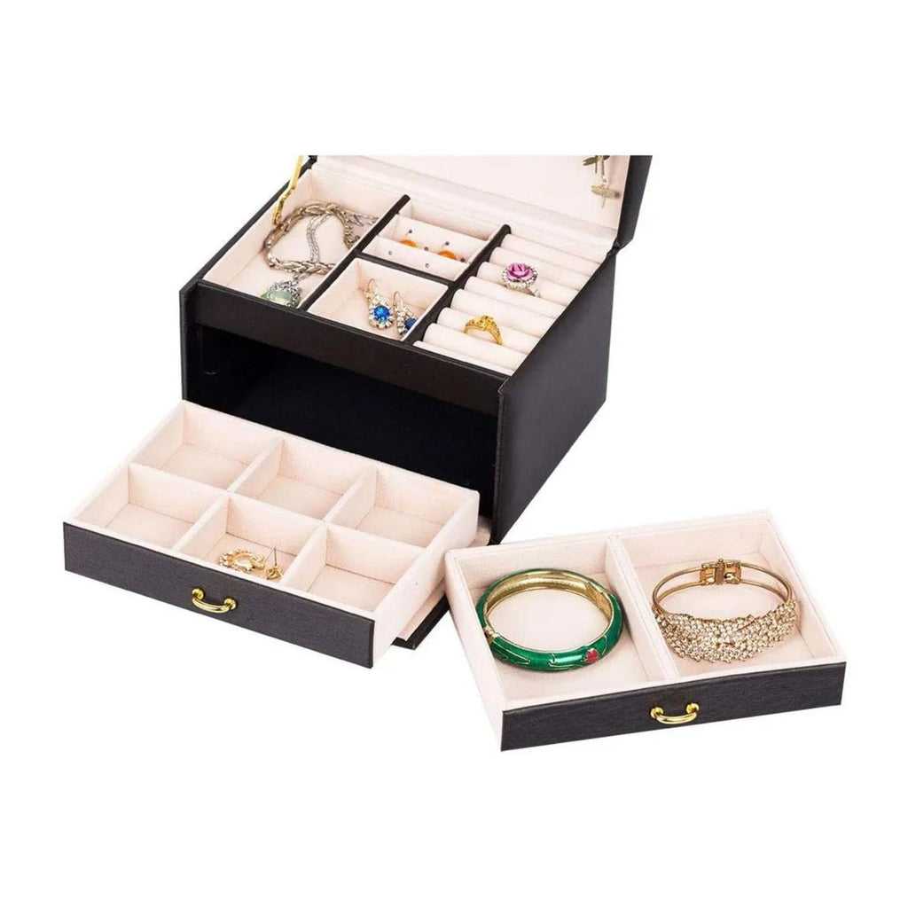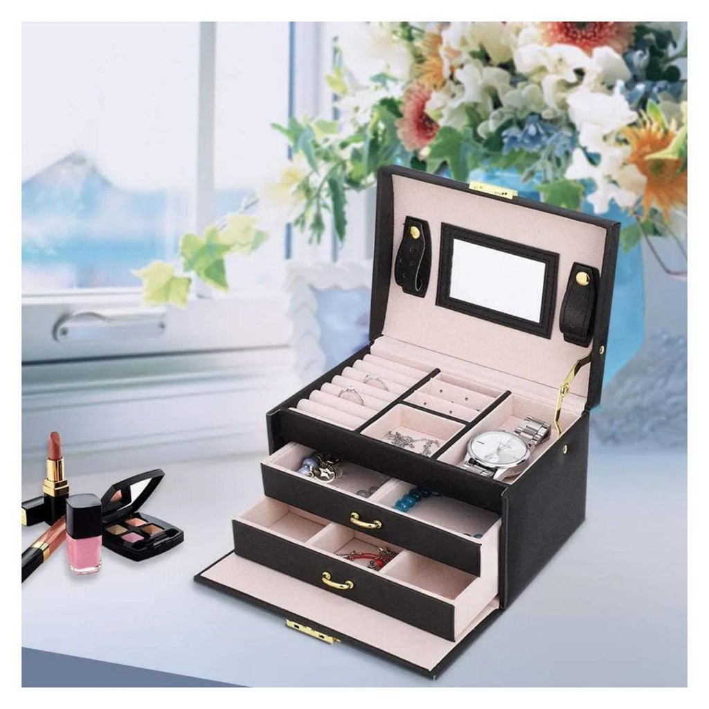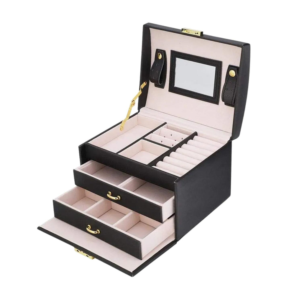 Este organizador de joyas multiusos de 3 niveles cuenta con una gran capacidad para almacenar y exhibir tus joyas y relojes, ayudando a mantener tu espacio ordenado y elegante. Fabricado en cuero PU de alta calidad, este joyero es duradero y fácil de limpiar, además incluye un práctico espejo de maquillaje incorporado para mayor comodidad. Su diseño sofisticado y color negro lo convierten en un complemento ideal para tu hogar o tienda, aportando funcionalidad y estilo.