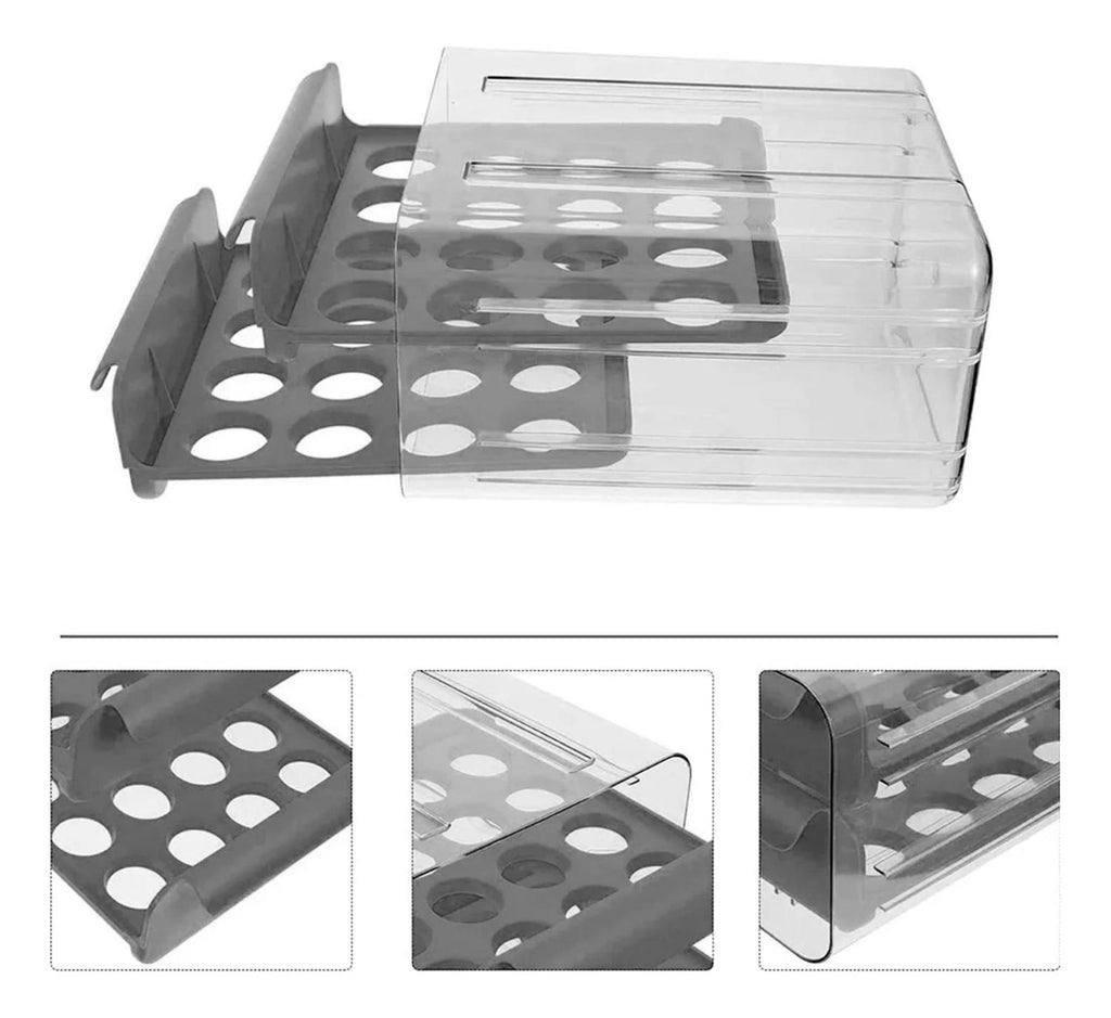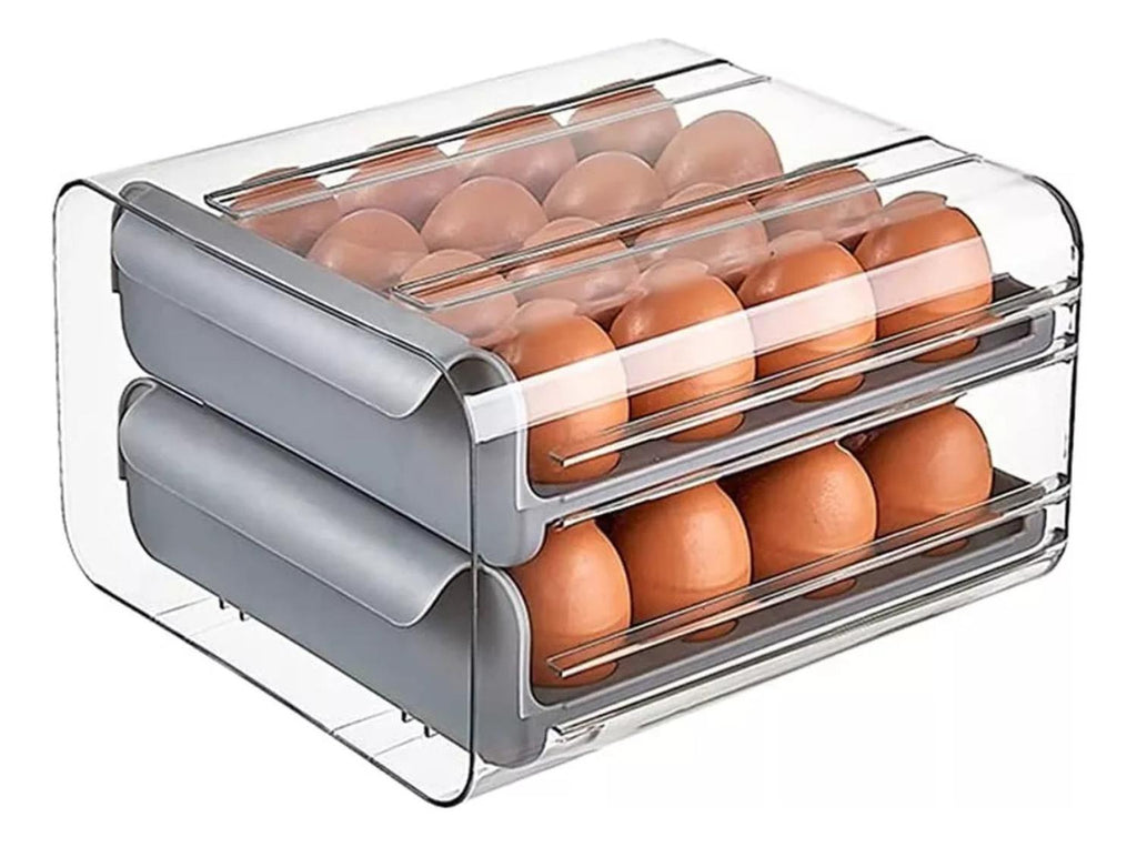 Este organizador de huevos de dos niveles es una solución compacta y práctica para mantener los huevos protegidos y ahorrar espacio en la cocina. Su diseño simple permite almacenar huevos en dos bandejas, y su tamaño compacto permite su uso tanto en el refrigerador como en la alacena. Además, su diseño permite transportar los huevos fácilmente sin riesgos de agitación o choque. Medidas: 13.5 x 21.5 x 23.5 cm. Material: Plástico. Color: Gris. Capacidad: 32 Huevos. Producto 100% Recomendado. Garantia de 6 Meses.