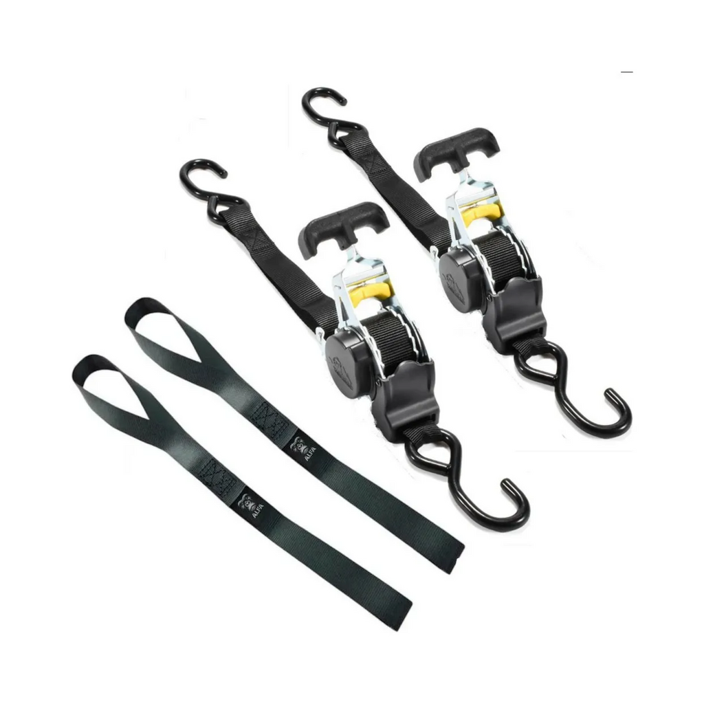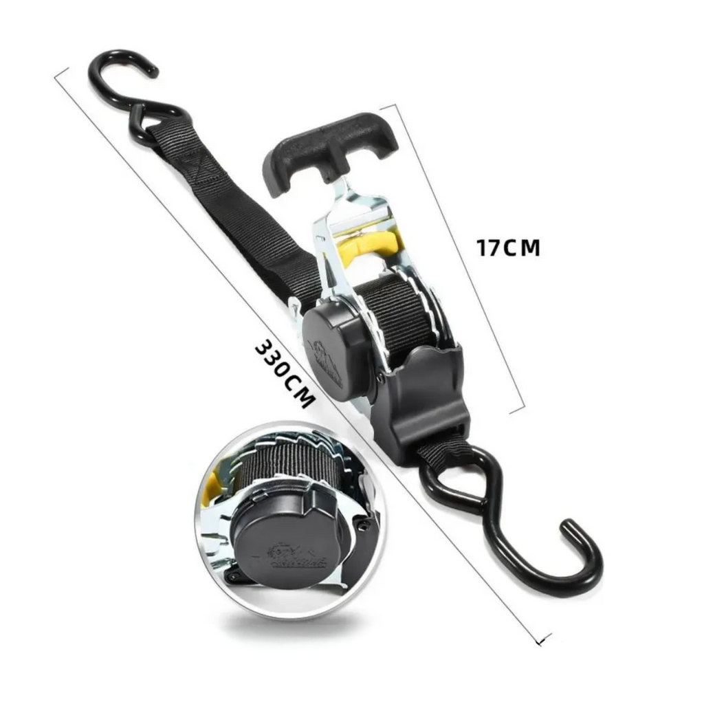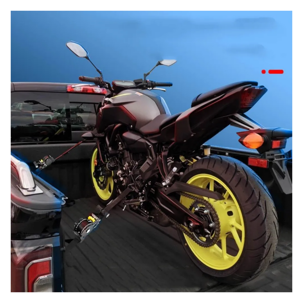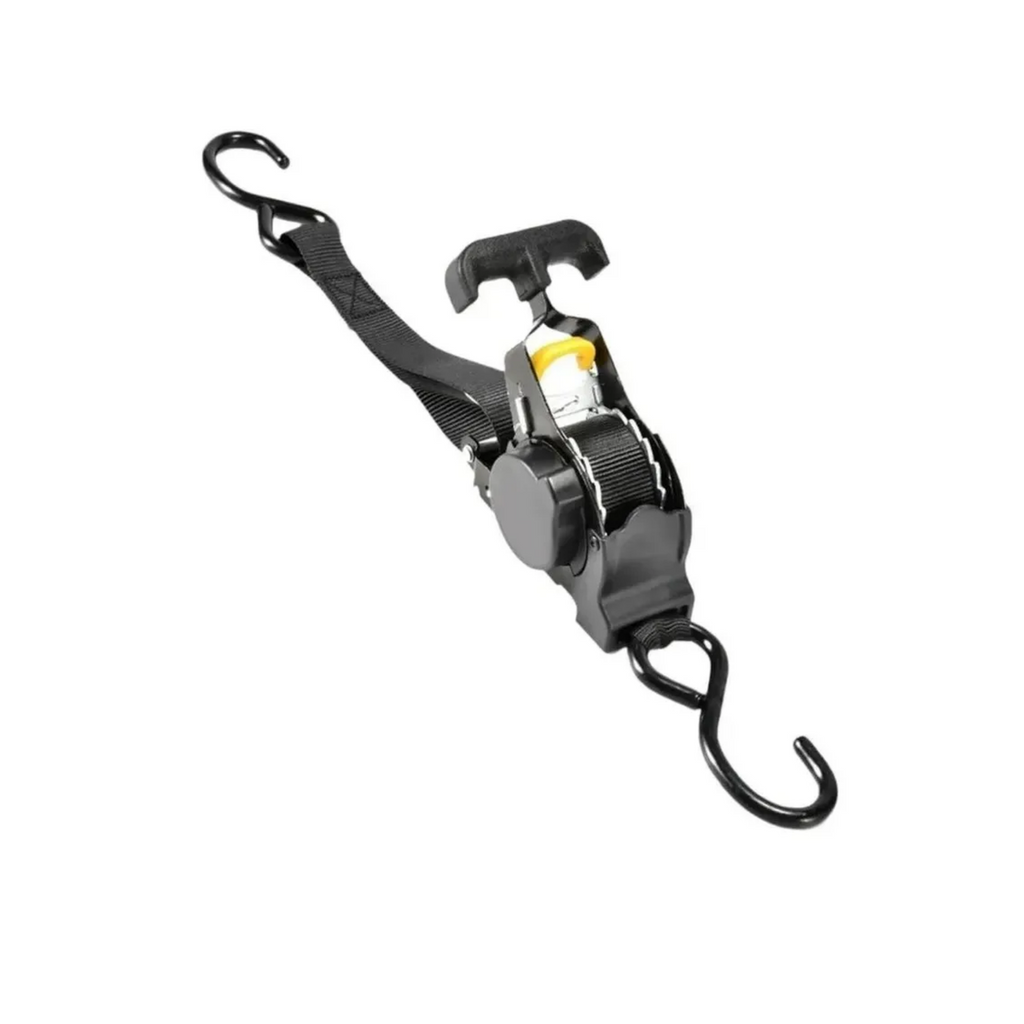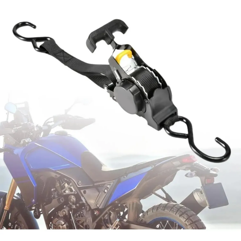 Pack de 2 eslingas correas de amarre retráctil con trinquete, diseñadas para ofrecer un pretensado seguro y práctico con un solo botón de guardado. Cada eslinga tiene una resistencia máxima de 680 kg, ideal para asegurar cargas como motos, UTVs, bicicletas y cargas comunes en camionetas. Incluye también 2 correas de soporte que ayudan a extender el alcance y proteger las superficies durante el amarre.