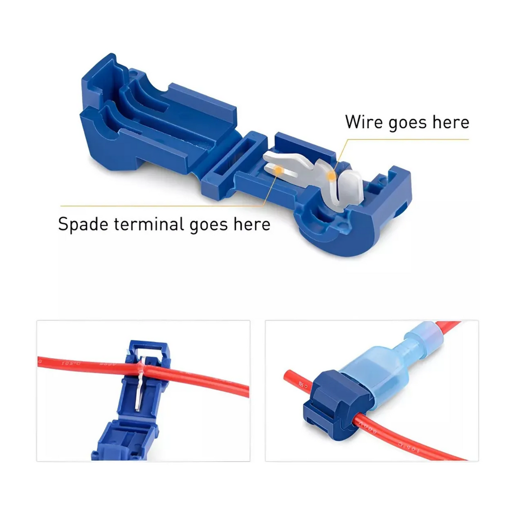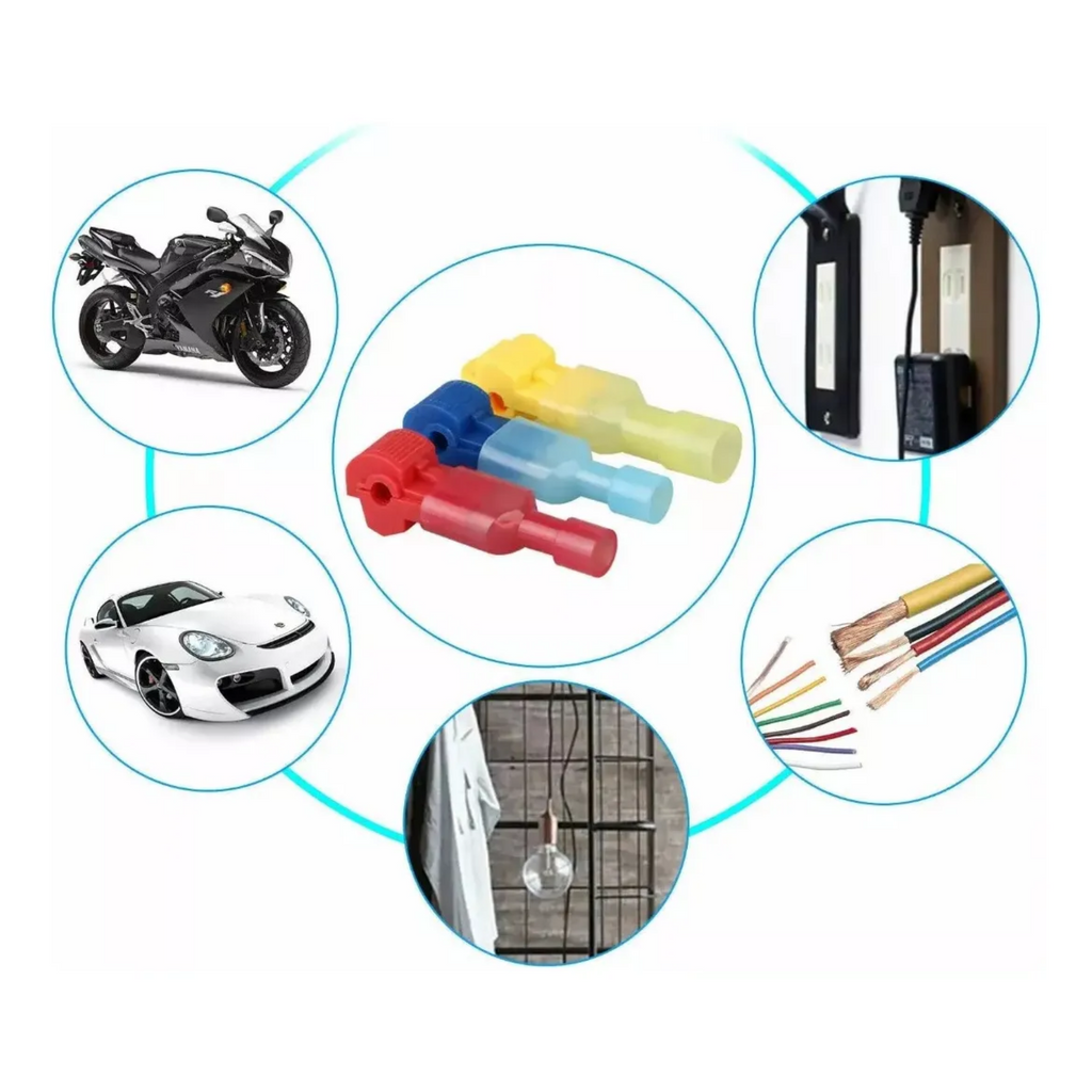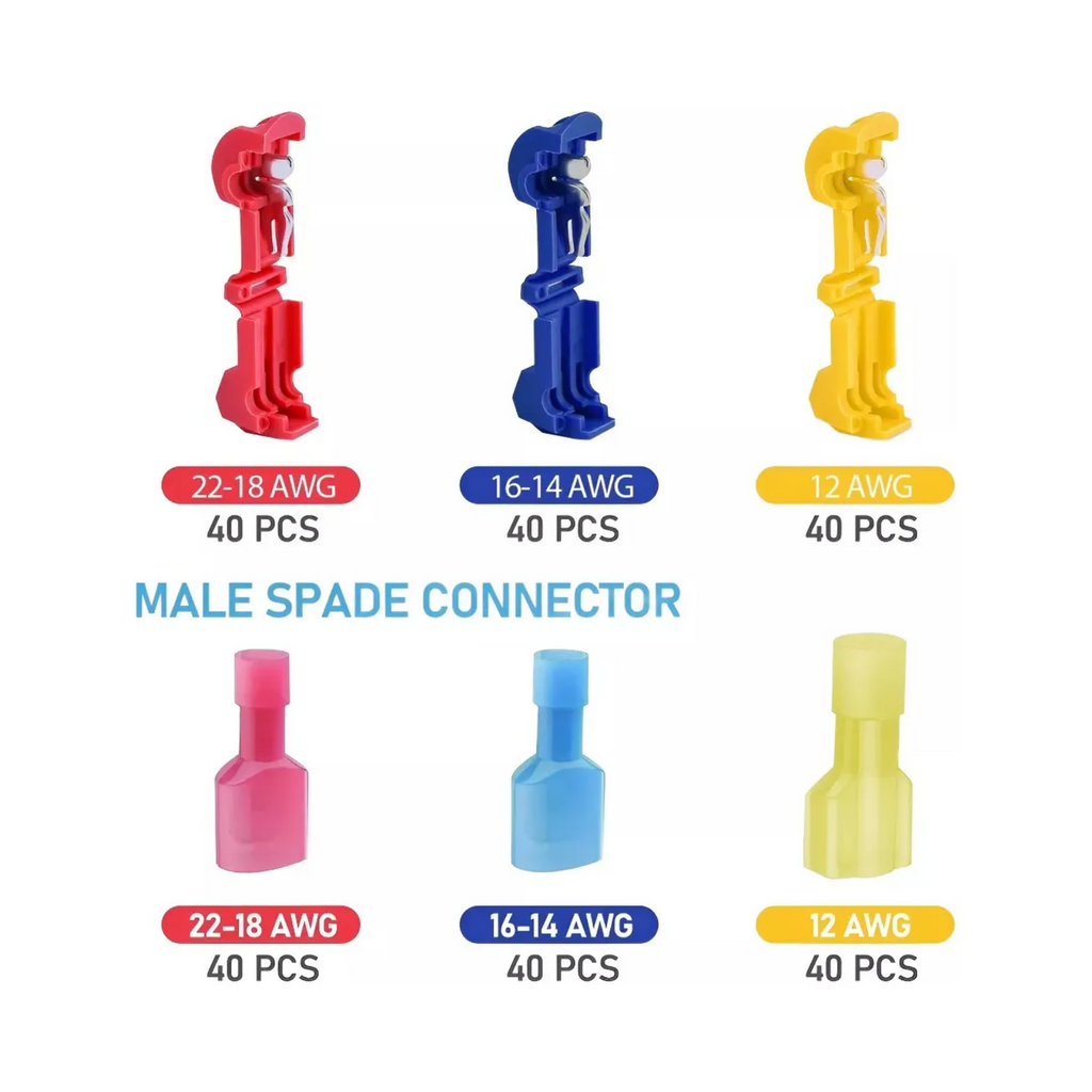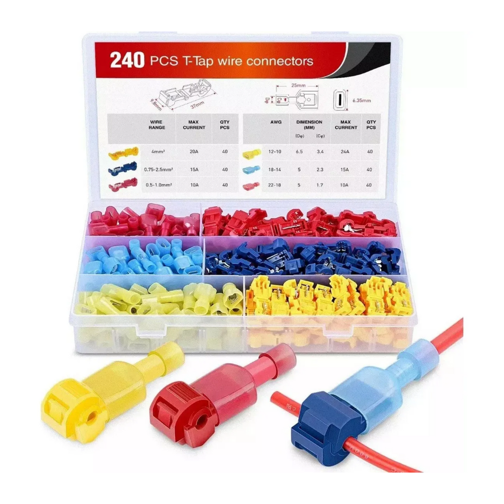 Pack de 240 terminales eléctricos tipo T, conectores rápidos para cables de 0,5 a 4 mm² (10-22 AWG). Ideales para conexiones automotrices y proyectos eléctricos que requieren empalmes rápidos sin cortar los cables originales. Cada conector permite un montaje seguro y eficiente en cables de diferentes calibres, facilitando instalaciones temporales o pruebas eléctricas.