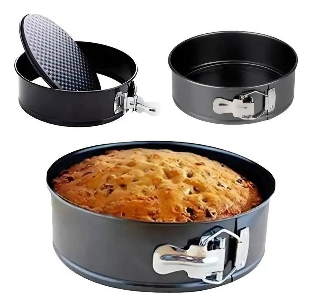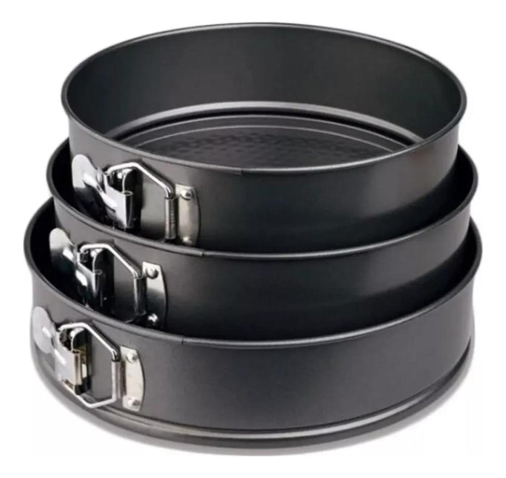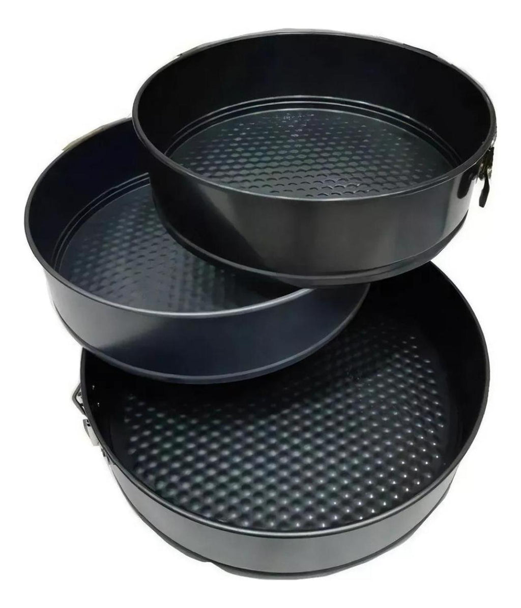Nuestros moldes con forma de resorte están hechos de acero de alto carbono y revestimiento antiadherente. alta calidad profesional que es duradero. Horno seguro. La hebilla proporciona una liberación rápida de productos horneados. un manejo fácil y un cierre preciso. Usted tendrá en su cocina un resistente juego de moldes de hornear de prolongada durabilidad dada su calidad. Uselos y compruebelo. Material: Acero Antiadherente. Color: Negro. Formato Venta: Pack.