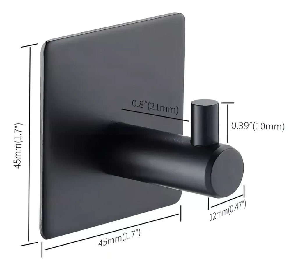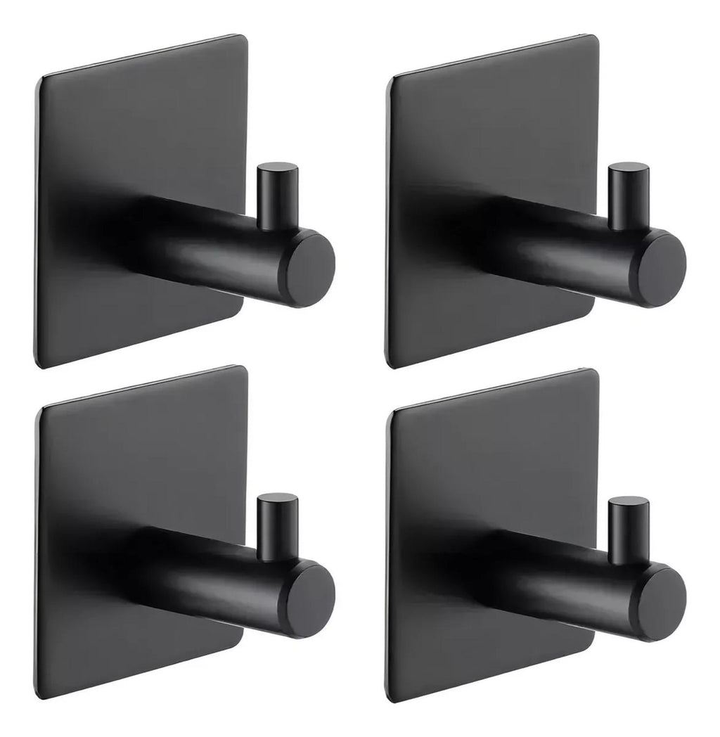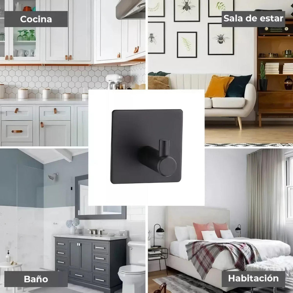 Set de 4 ganchos adhesivos de acero inoxidable en color negro, diseñados para usarse en ambientes húmedos como baños y cocinas. Son ideales para superficies lisas y duras como azulejos, madera, metal, plástico o vidrio, ofreciendo una solución práctica y sin perforaciones para colgar toallas, sombrillas, abrigos, llaves, y más.La instalación es sencilla y rápida: solo retira la capa protectora del adhesivo, pega el gancho en la superficie deseada y presiona por 30 segundos. Para mejores resultados, se recomienda colgar objetos después de 24 horas, garantizando una fijación segura y duradera.Características principales:• Medidas: 4.5x 4.5 x 2.7 cm• Material: Acero inoxidable• Color: Negro• Medidas del empaque: 4.5x 4.5 x 2.7 cm• Peso del producto: 1,5 kg • Producto 100% recomendado• Garantía: Legal de 6 meses